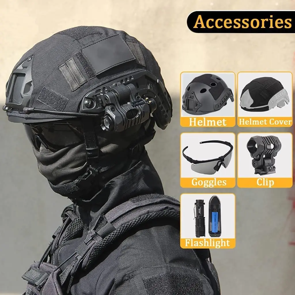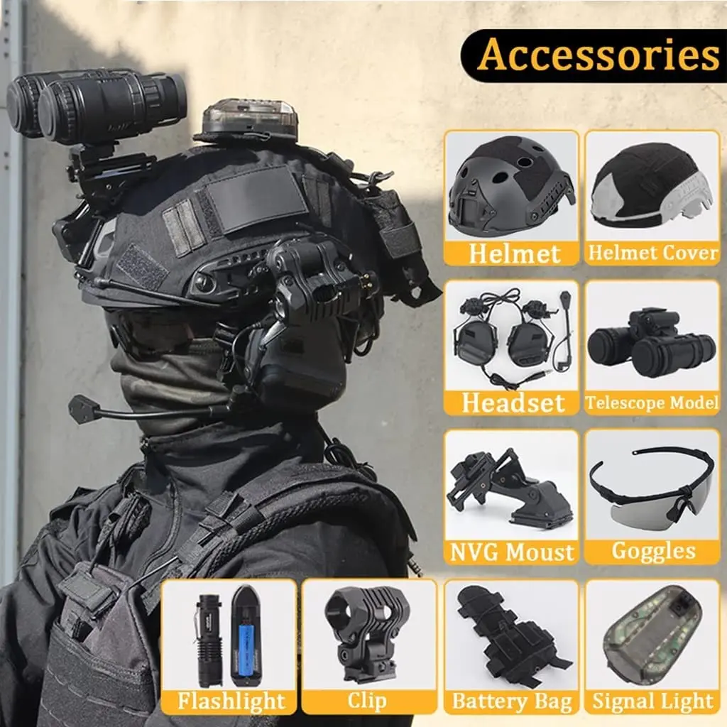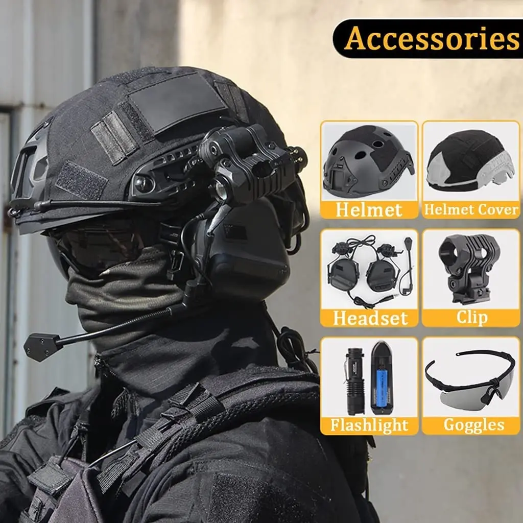 ►Combinación súper perfecta:Casco con auriculares tácticos y cubierta de casco y gafas y juegos de modelos de telescopio. Dale al usuario una protección completa de 360 °, protege tu cabeza para que no se dañe en el juego de paintball. Tamaño de la cabeza 52 ~ 66cm (20-26 pulgadas).