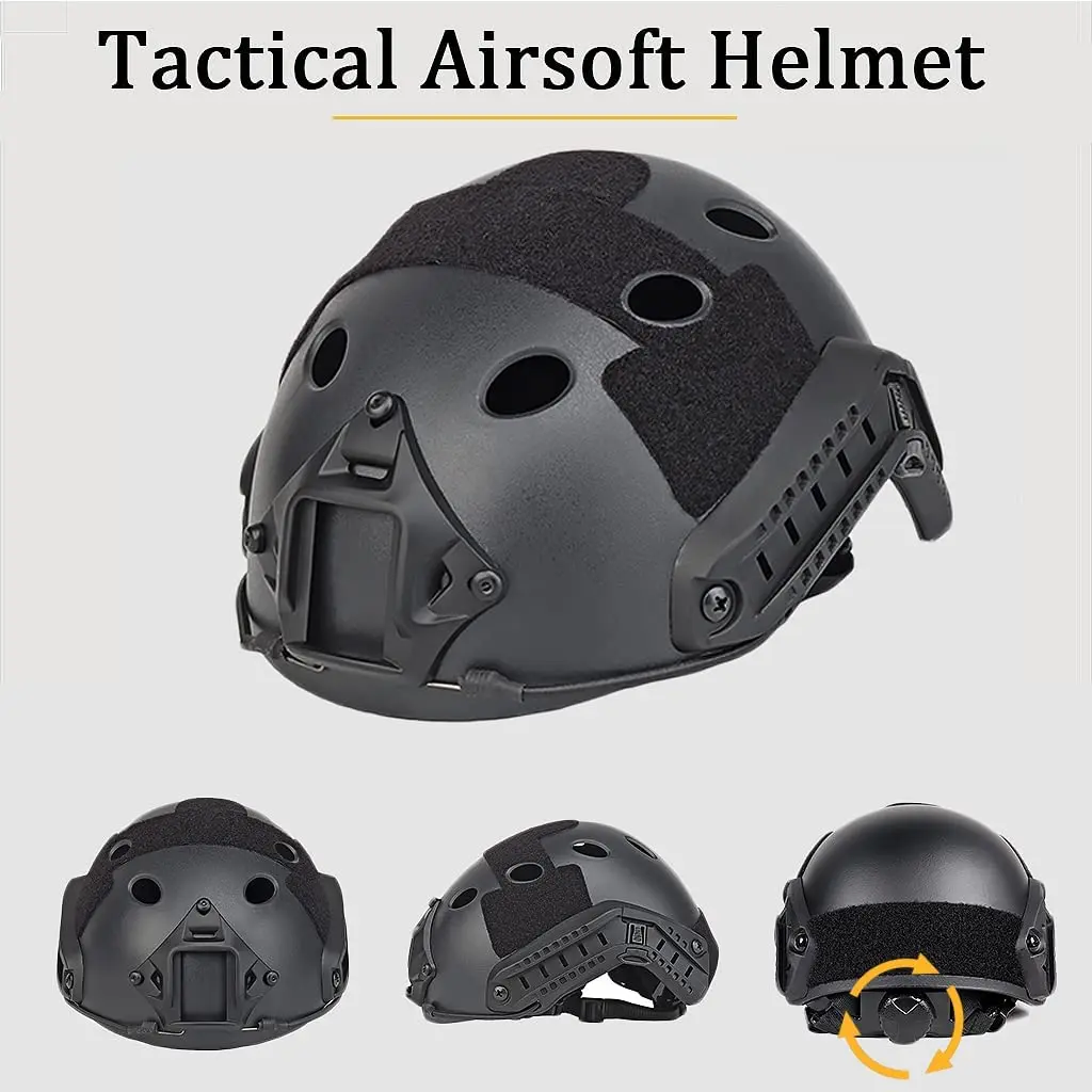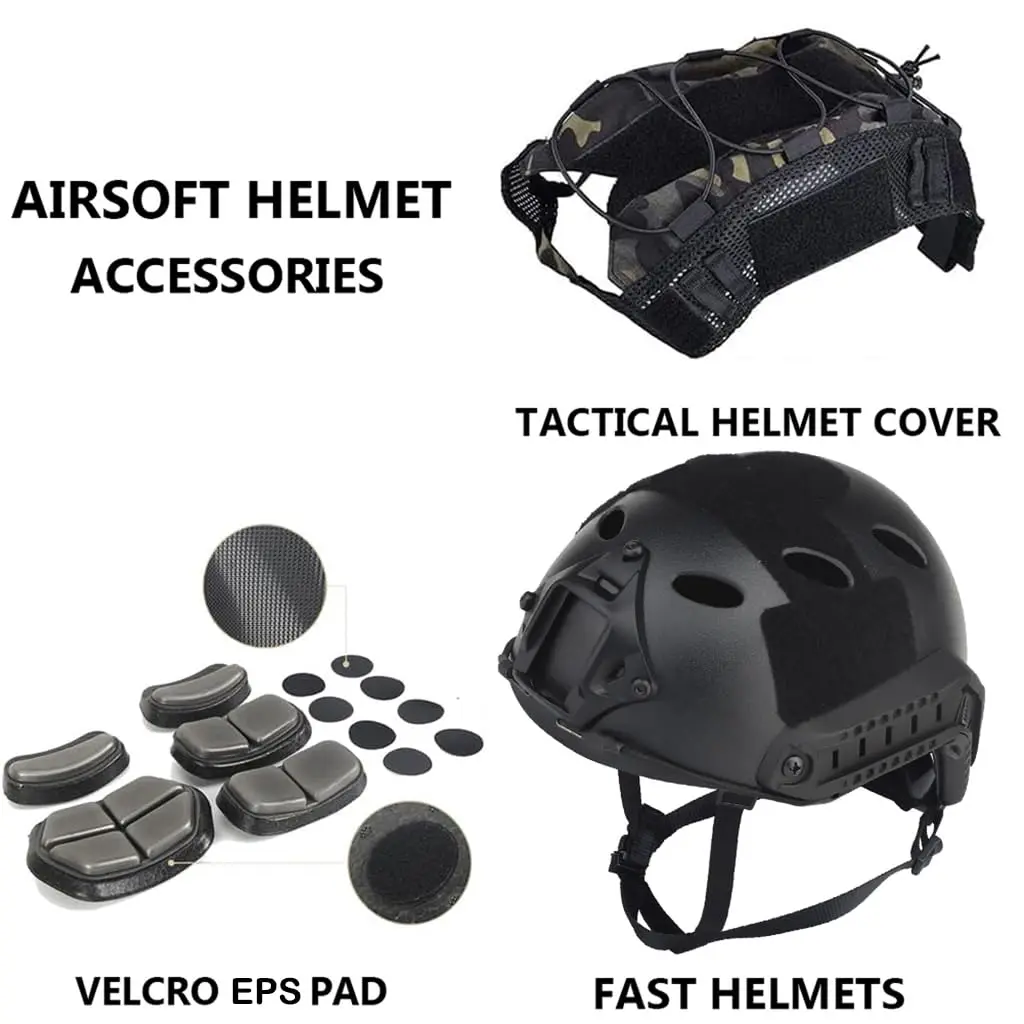 ★ Casco Airsoft tipo PJ: Plásticos de ingeniería ABS + Plástico de espuma antisísmica + Nylon.Viene con 5 cómodas almohadillas EPS, que reducen el impacto en las lesiones en la cabeza; Los rieles laterales permiten al usuario conectar accesorios y equipo táctico.