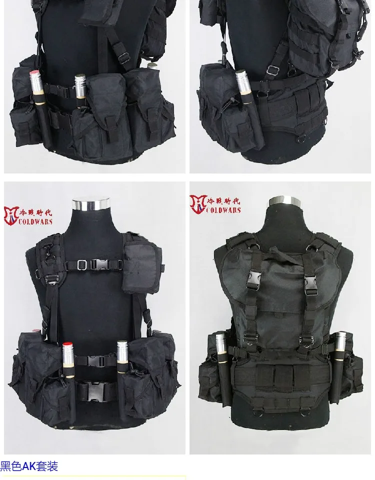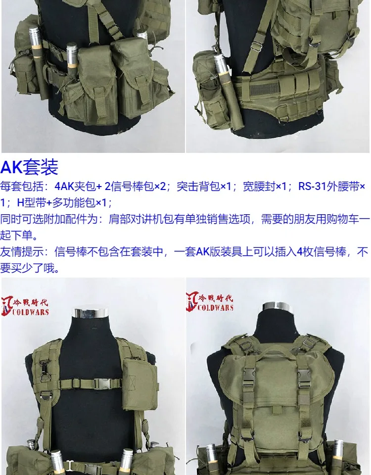 Cada juego AK incluye: 4 bolsas para cargadores AK + 2 bolsas acampanadas de señal × 2; 1 mochila de asalto; 1 cinturilla ancha; 1 cinturón exterior RS-31; 1 correa en forma de H + bolsa multifuncional.