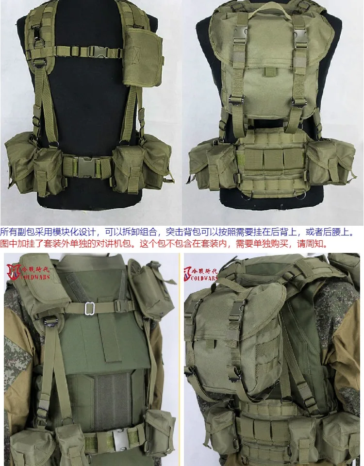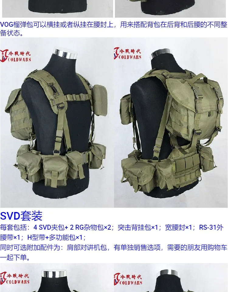 Cada juego SVD incluye: 4 bolsas para cargadores SVD + 2 bolsas diversas RG × 2; 1 mochila de asalto; 1 cinturilla ancha; 1 cinturón exterior RS-3; 1 correa en forma de H + 1 bolsa multifuncional.
