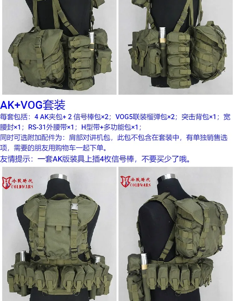 Cada juego AK+VOG incluye: 4 bolsas para cargadores AK + 2 bolsas acampanadas de señal × 2; 2 bolsas para granadas VOG de 5 vueltas; 1 mochila de asalto; 1 cinturilla ancha; 1 cinturón exterior RS-3; 1 correa en forma de H + 1 bolsa multifuncional.