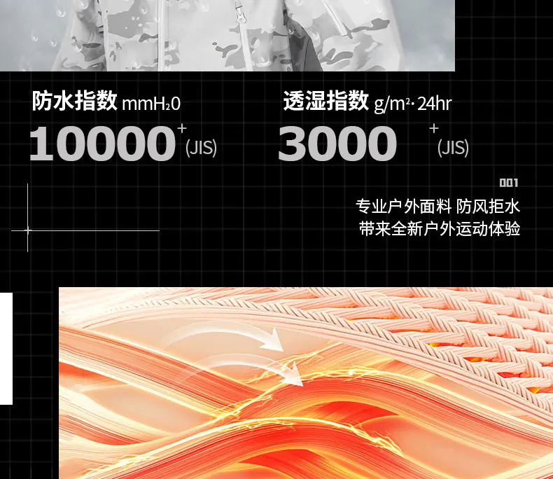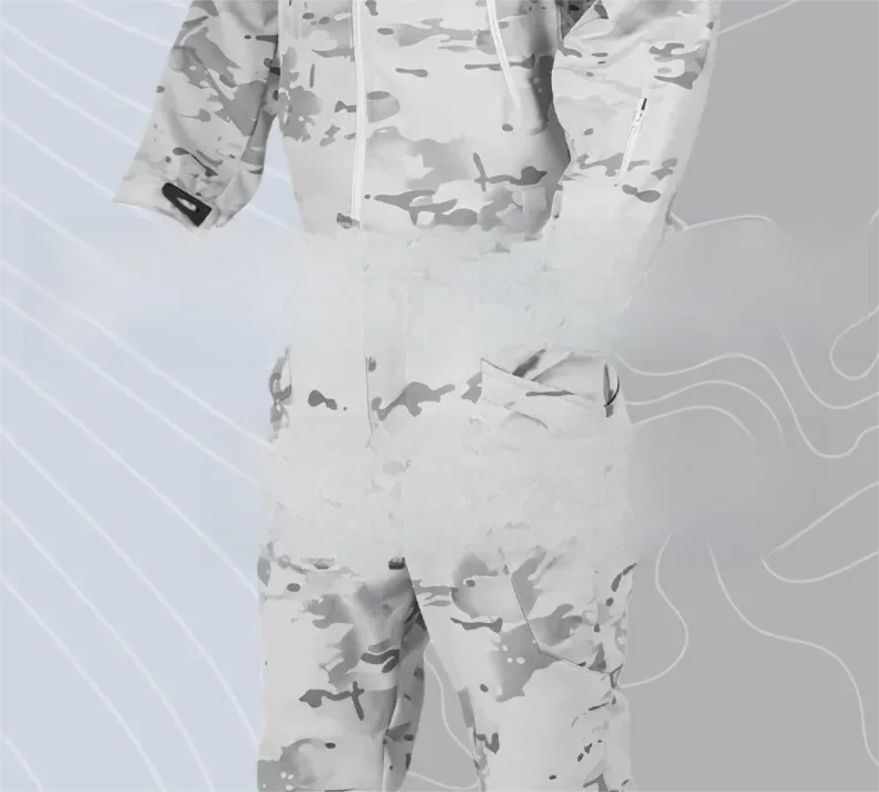 Este conjunto de chaqueta táctica de camuflaje de nieve suave está hecho de tela 100% poliéster.Cuenta con una capa exterior profesional con un índice de impermeabilidad de más de 10.000 mmH2O y un índice permeable a la humedad de más de 3.000 g/m2·24 h.Es resistente al viento, al agua y transpirable.