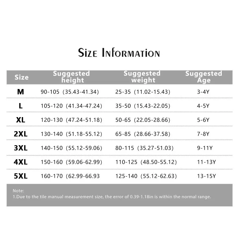 4XL 150 - 160 (59,06 - 62,99)----110 - 125(48.50 - 55.12)----11-13 años