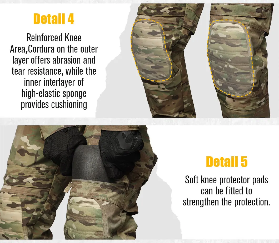 4.Zona de rodilla reforzada: Tejido de nailon Cordura reforzado en la parte frontal de la rodilla para mejorar la resistencia a la abrasión.