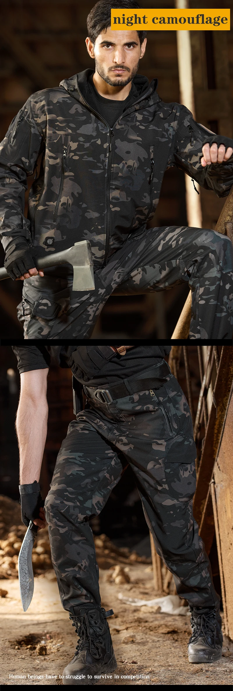 Conjuntos de chaquetas tácticas de invierno para hombre, chaqueta de caza y senderismo de concha suave para exteriores, traje con capucha, pantalones Cargo de lana, chándales, cortavientos
