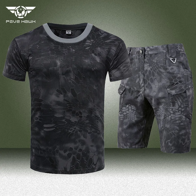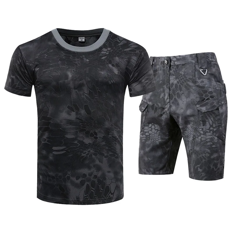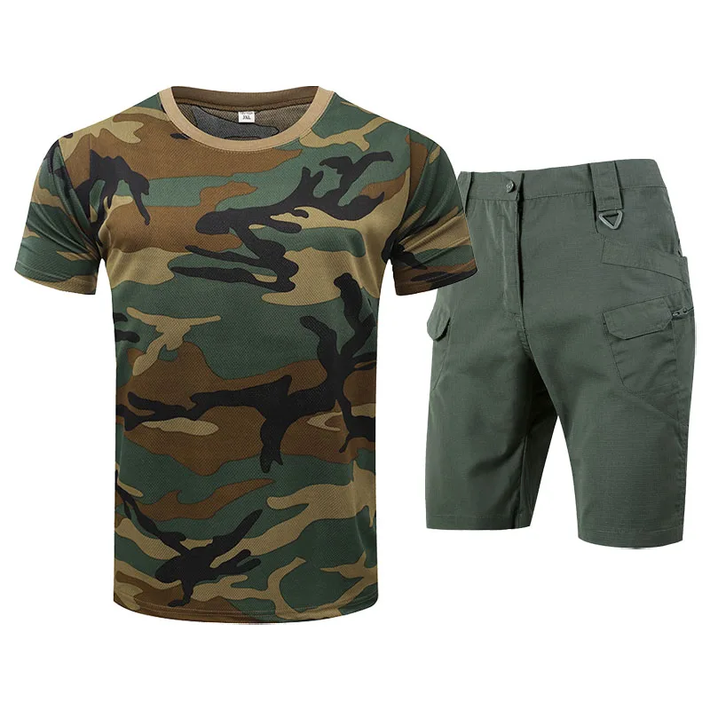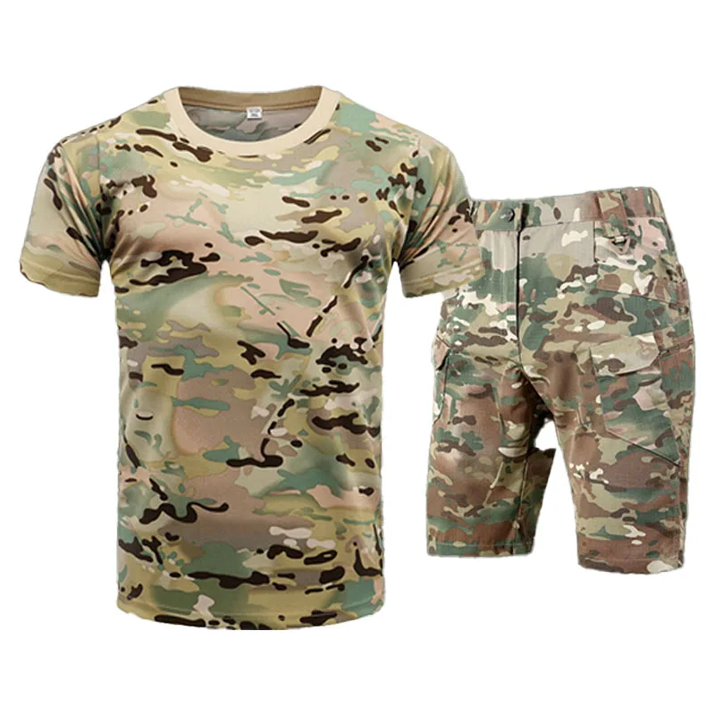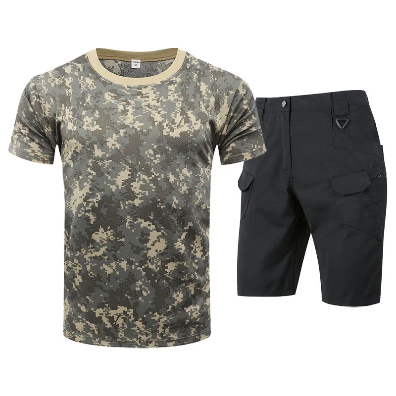 Conjuntos militares de camuflaje para hombre, camisetas tácticas de manga corta de secado rápido para exteriores, pantalones cortos de carga transpirables con múltiples bolsillos, Verano