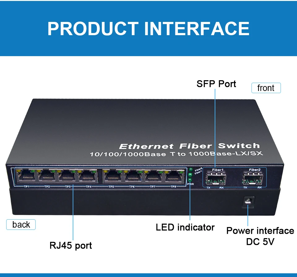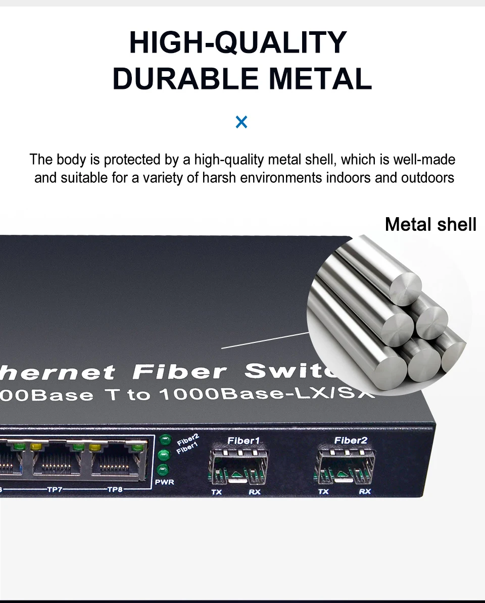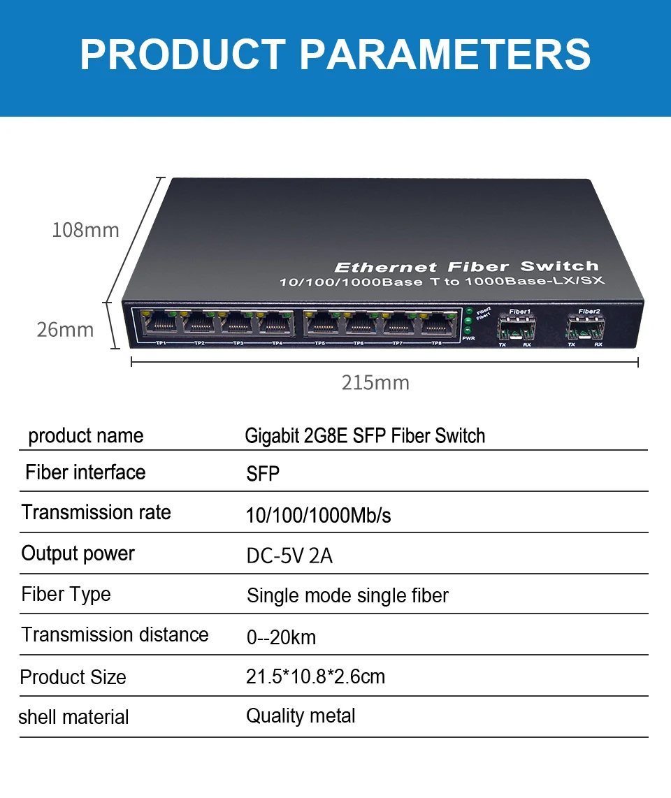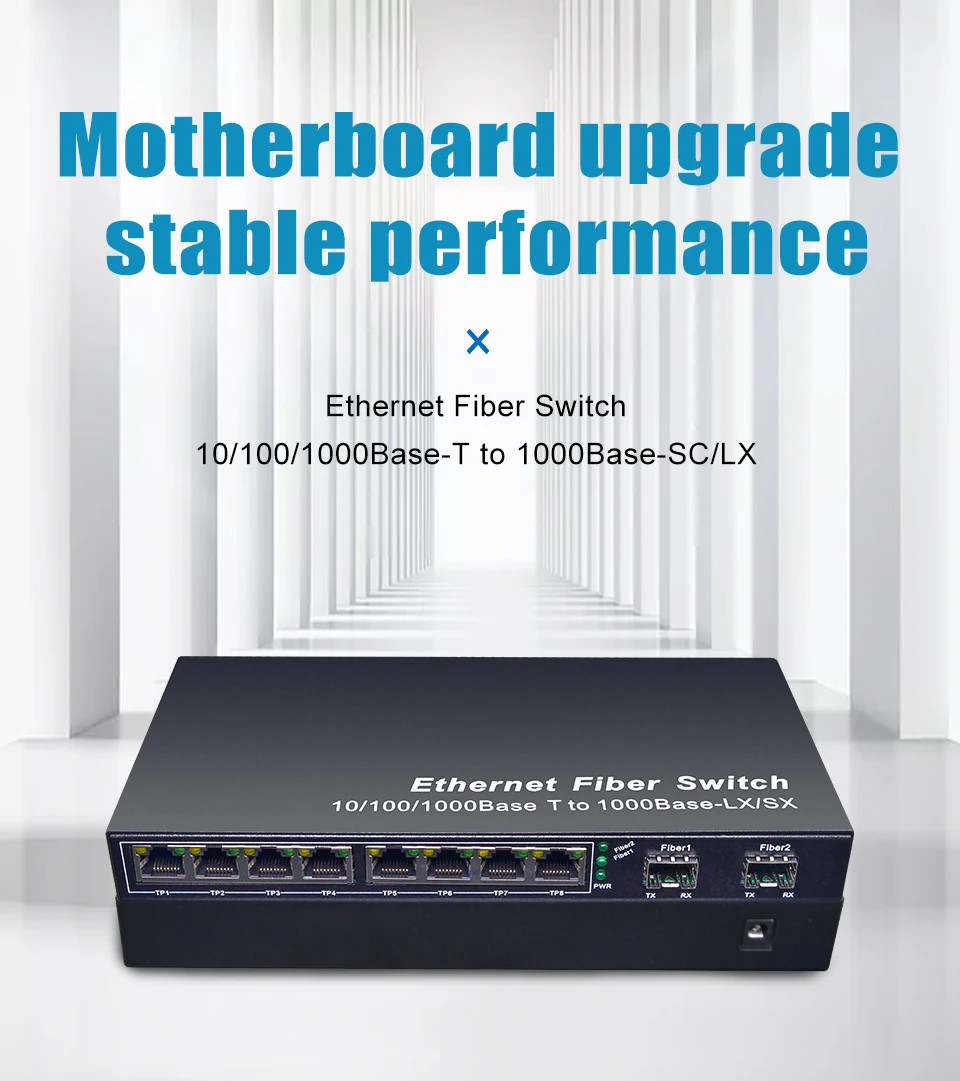 Conmutador de fibra SFP de red Gigabit, convertidor de medios SFP de 1000Mbps, 2 puertos de fibra SFP y 8 puertos RJ45, conmutador Ethernet de fibra 2G8E