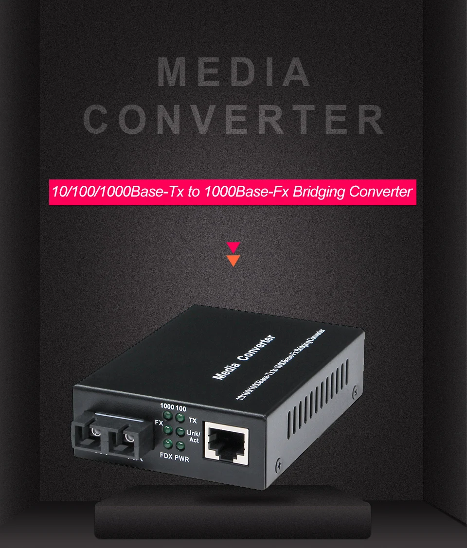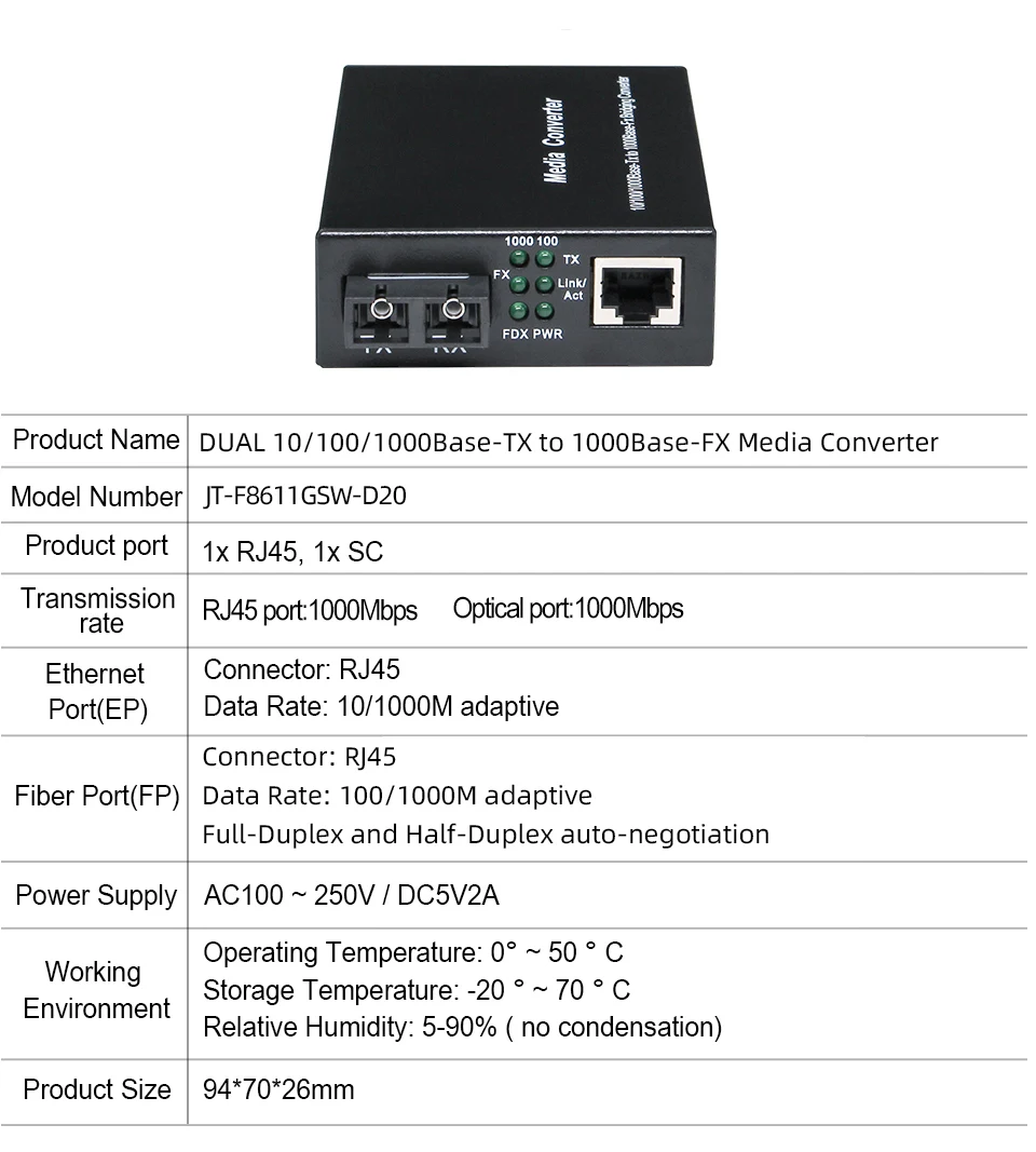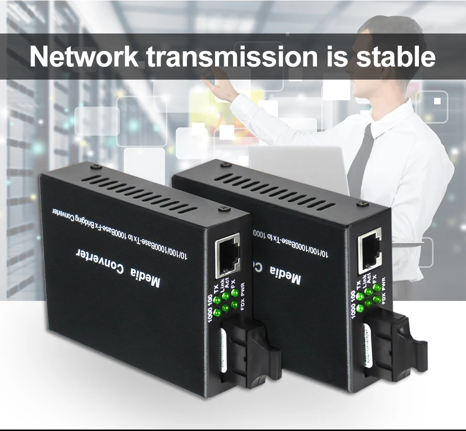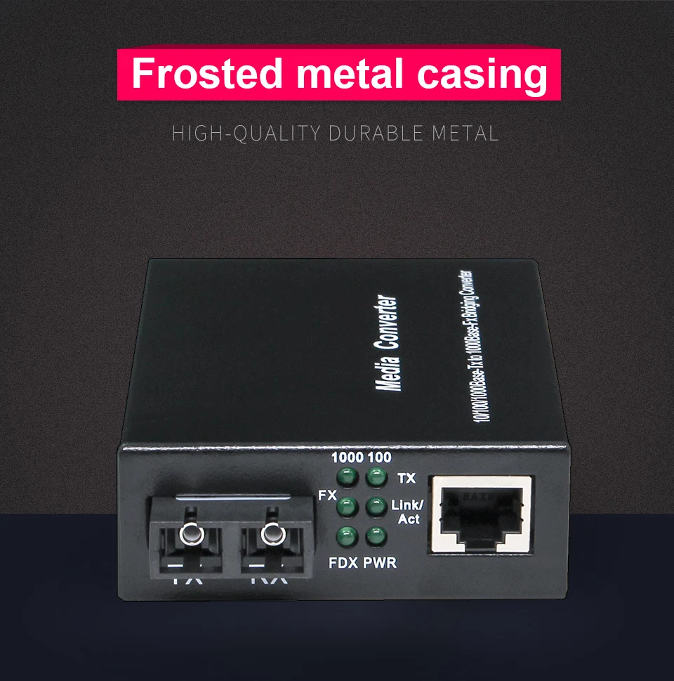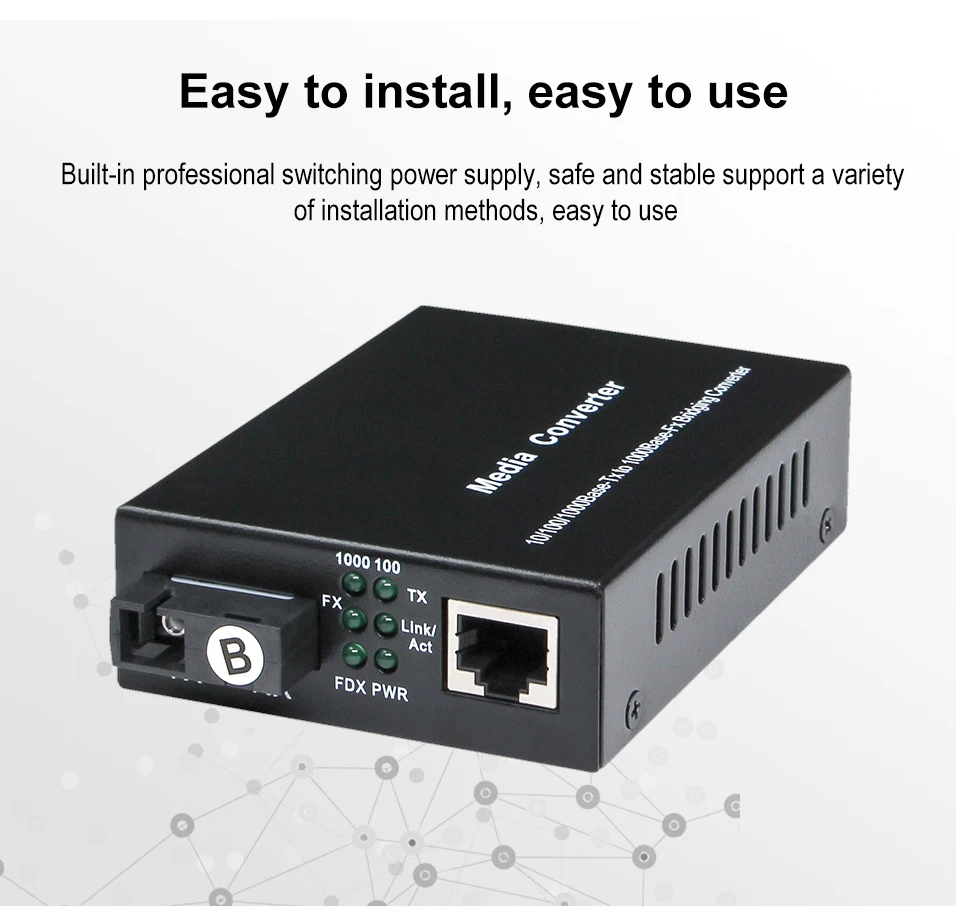 Convertidor de medios de fibra Gigabit Ethernet con transceptor SC monomodo integrado de 1Gb, 10/100/1000M, RJ45 a 1000Base-LX, hasta 20km