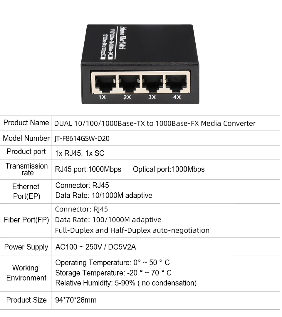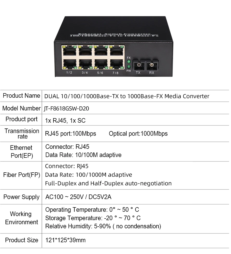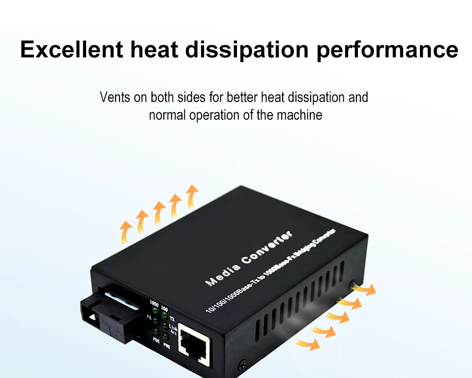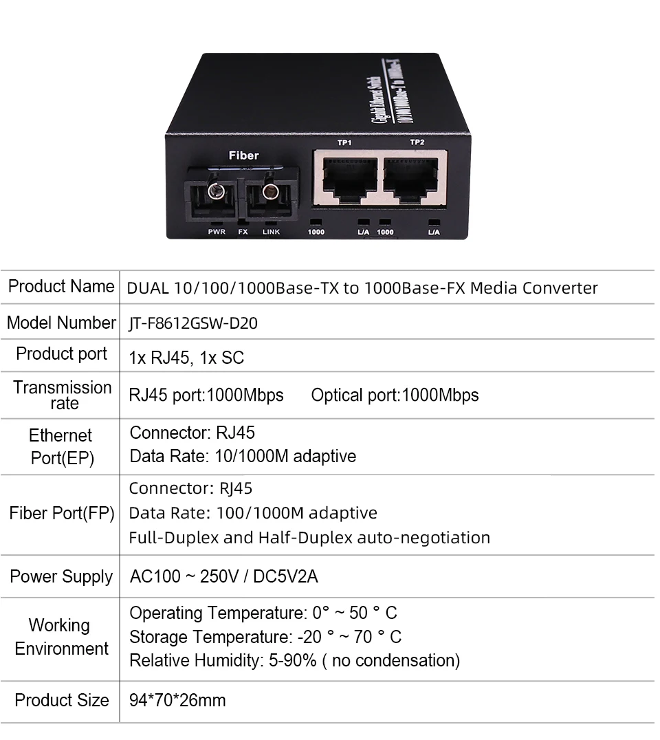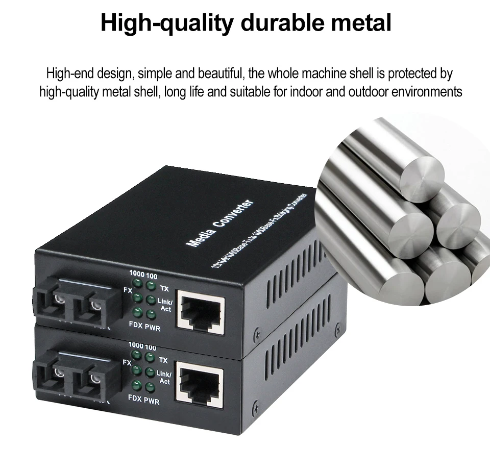 Convertidor de medios de fibra Gigabit Ethernet con transceptor SC monomodo integrado de 1Gb, 10/100/1000M, RJ45 a 1000Base-LX, hasta 20km