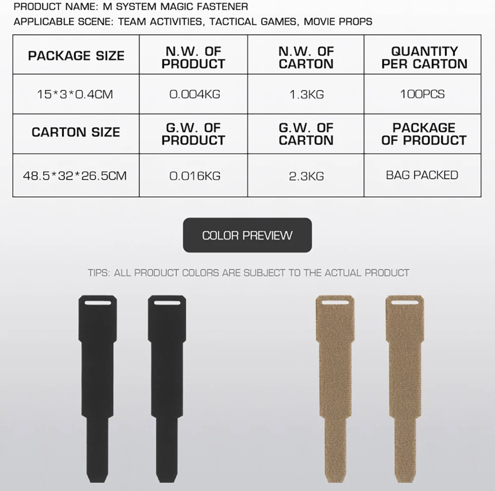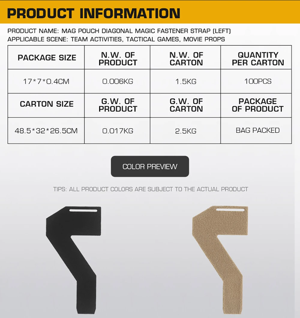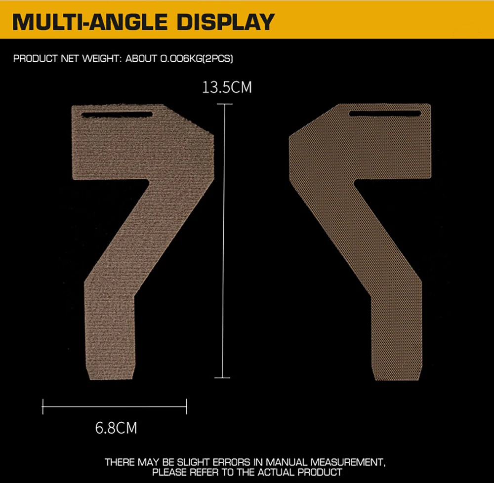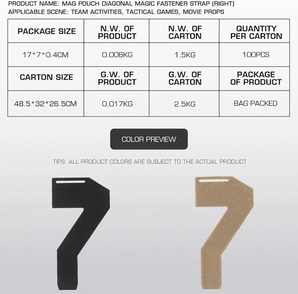 Tamaño del producto: 17*7*0,4 CM Peso neto del producto: 0,006 KG Color del producto: Negro/Tan Escena aplicable: actividades en equipo, juegos tácticos, accesorios de películas. Material principal: sujetador mágico