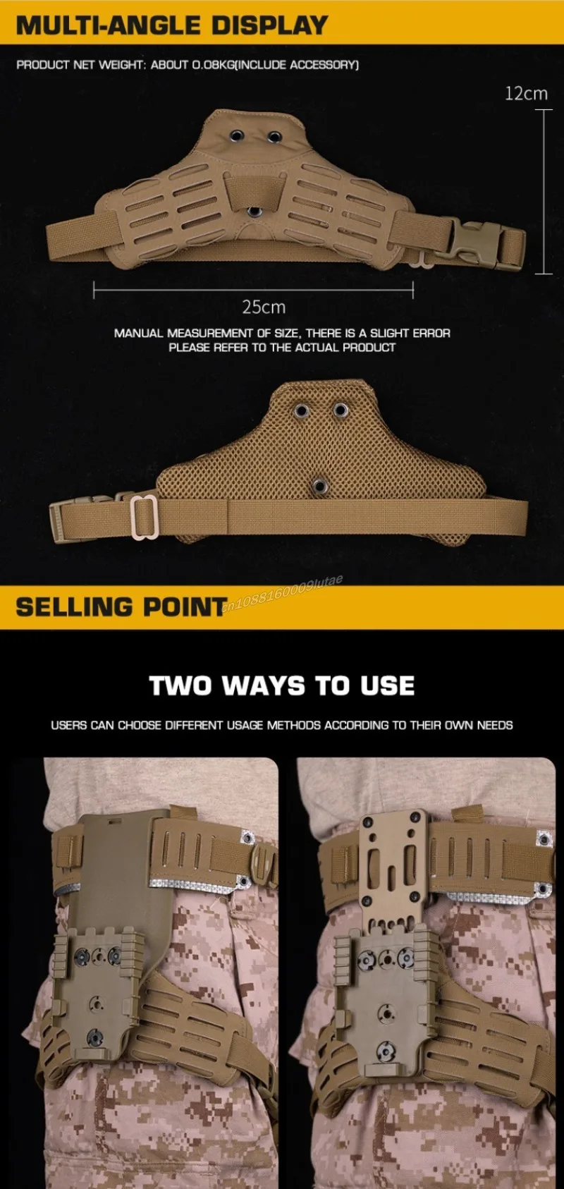 Los muslos pueden estar hacia la izquierda o hacia la derecha, el sistema molle cortado con láser puede transportar cualquier bolsa funcional molle.