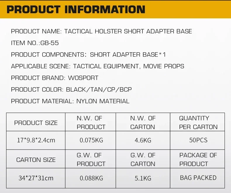 Color: negro.tan, verde, CP,BCP Peso: alrededor de 40 g Tamaño:17x9,8x2,4cm Uso: caza/exterior/guardia/CS