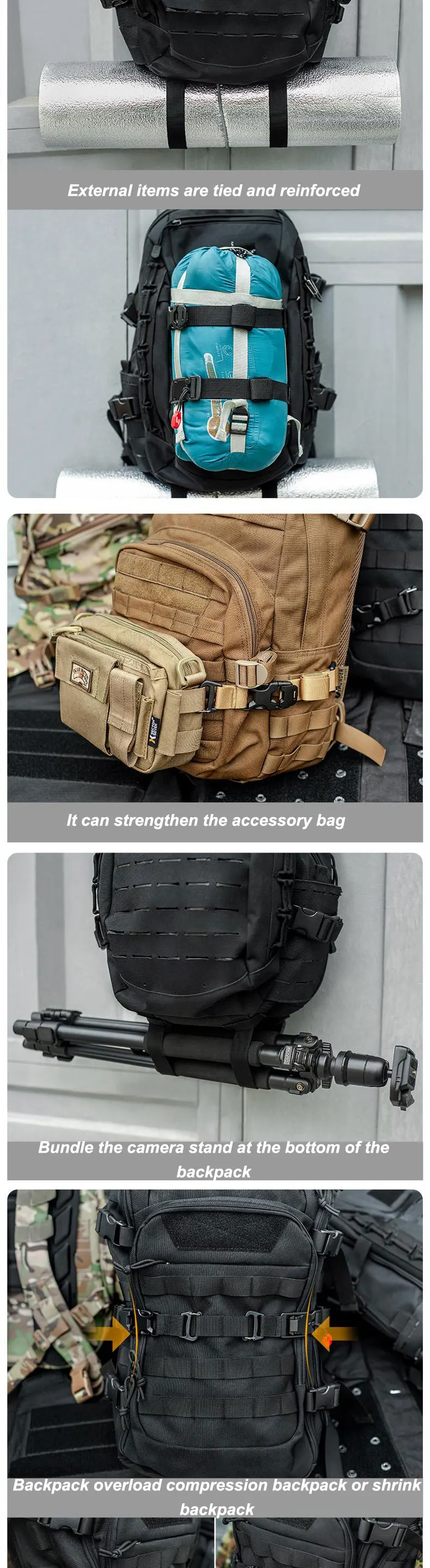 Adecuado para varios tipos de mochilas: mochilas tácticas o de exterior.Especificaciones: