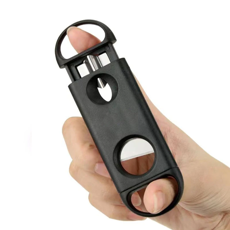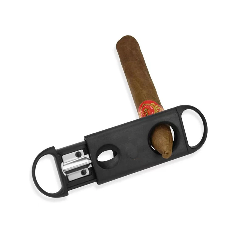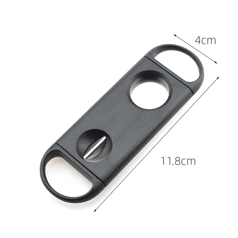 Ofrecemos dos tipos de tijeras para cigarros, una en acero inoxidable y la otra en plástico negro.