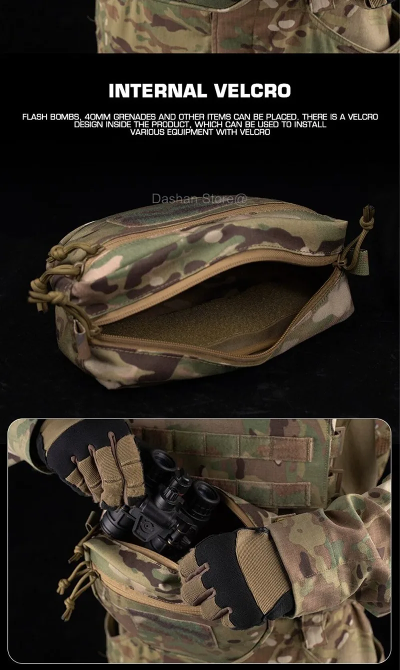 Ampliamente adaptable:Esta bolsa bajo el vientre se puede utilizar en la mayoría de los portadores de placas tácticas o plataformas tácticas para el pecho.