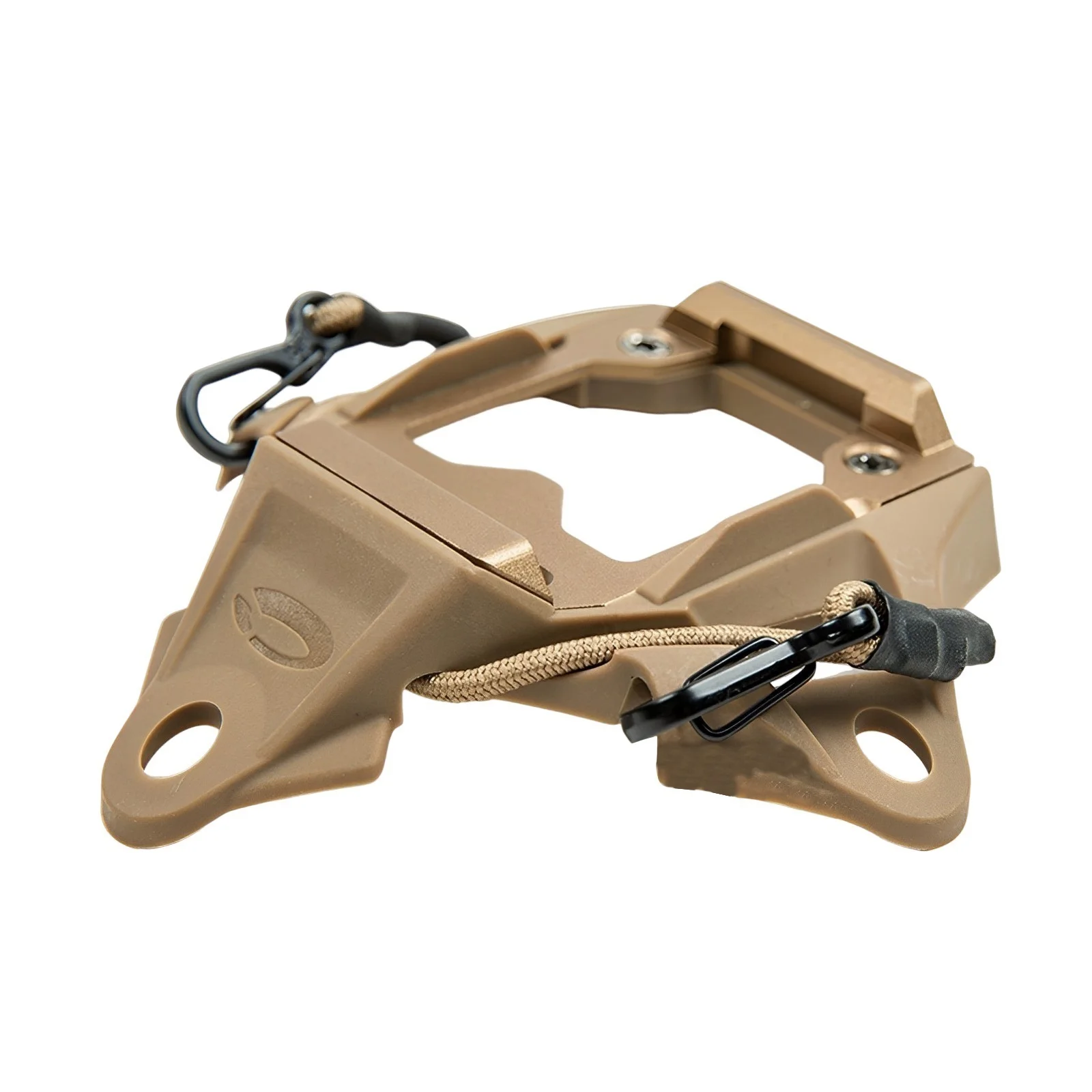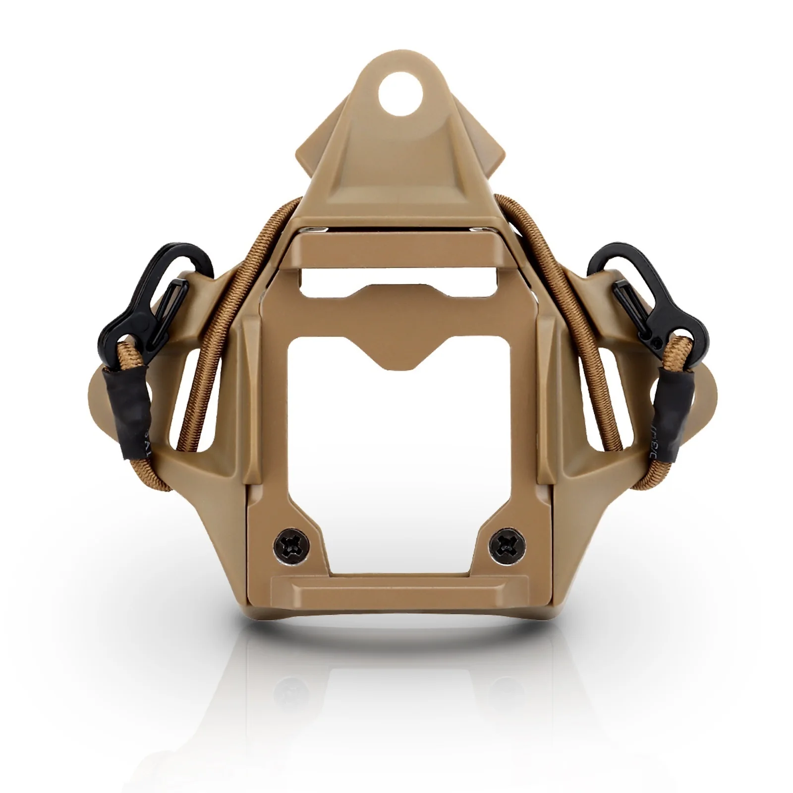 Made of a hybrid lightweight polymer frame and removable/replaceable machined mounting insert, Modular Bungee Shroud provide a secure attachment at the front of the helmet for NVGs, video cameras, illuminators.