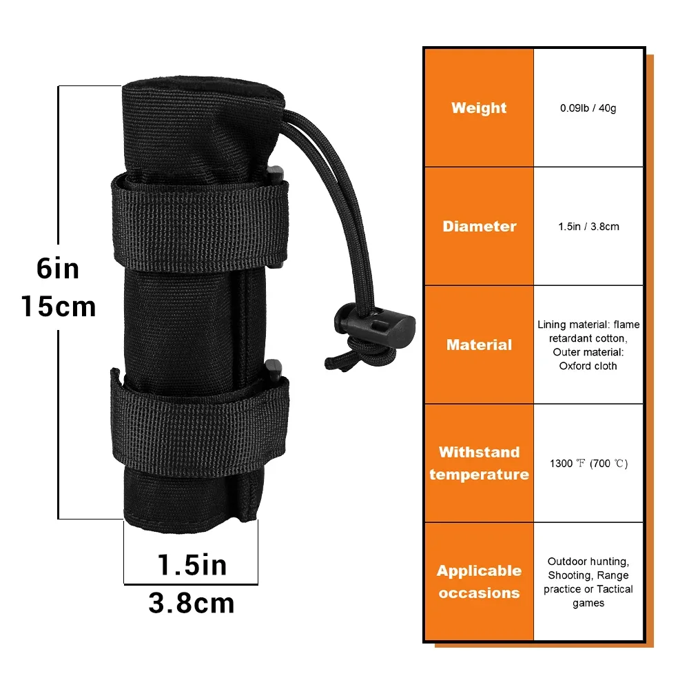 Suppressor cover inner is made of high temp resistance material rated to 1300 degrees F, a durable nylon fabric shell, a heat-resistant aramid rope and 2 adjustable straps for firmly keeping on the suppressor and preventing slipping.
