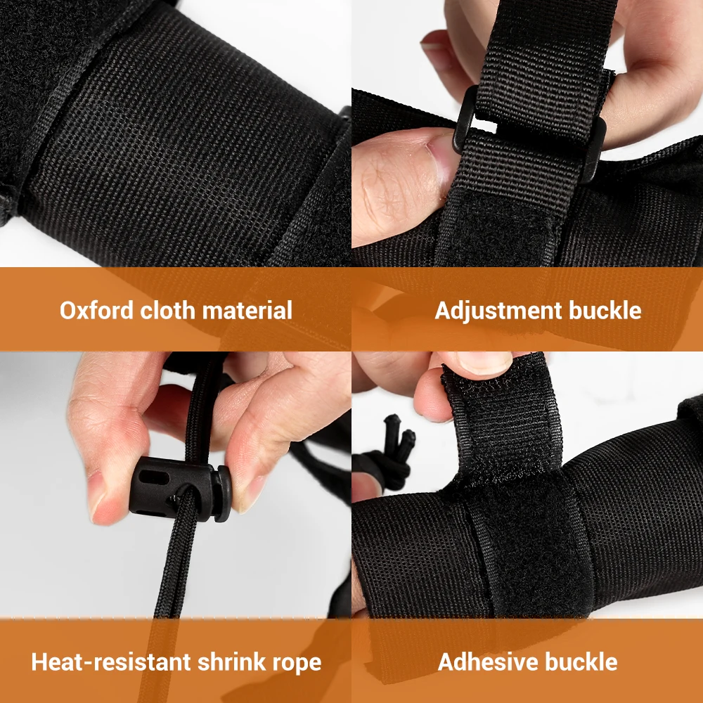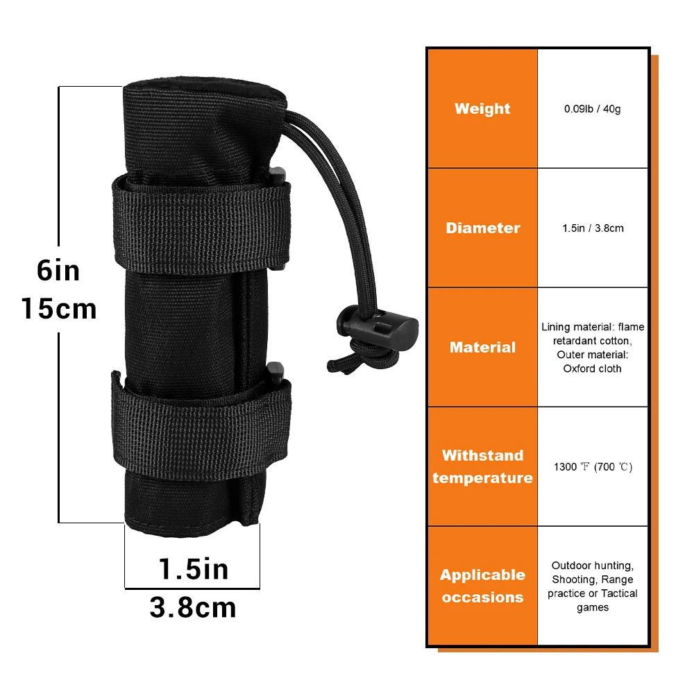 La cubierta interior del supresor está hecha de material resistente a altas temperaturas con capacidad de 1300 grados F, una carcasa de tela de nailon duradera, una cuerda de aramida resistente al calor y 2 correas ajustables para mantenerse firmemente en el supresor y evitar resbalones.