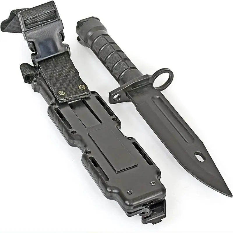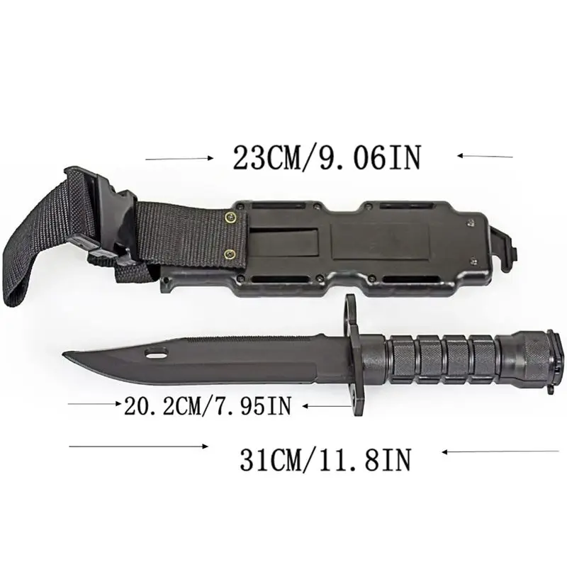 Fácil de transportar: estructura de nailon de alta densidad, se puede colgar en el cinturón, fácil de usar, ¡muestre sus habilidades!Equipado con bayoneta simulada de plástico para pistola de aire comprimido M9 con mango antideslizante BS para un uso cómodo