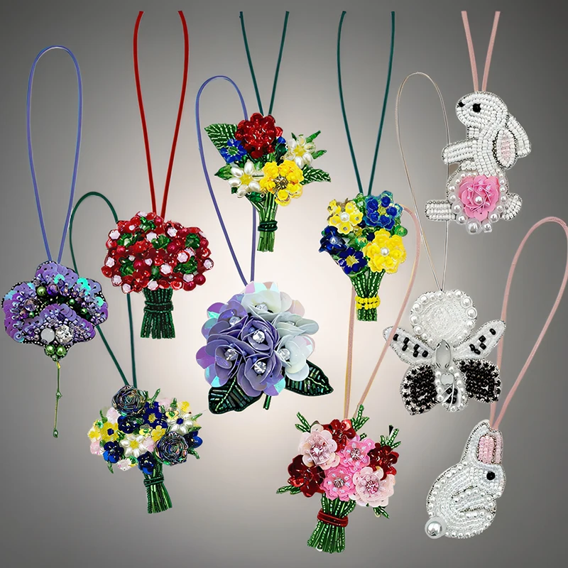 Cuentas de diamantes de imitación hechas a mano con flores en 3D, parches de cuerda para colgar, colgantes de mochila, parches de cordón de cristal, decoración colgante de bolso