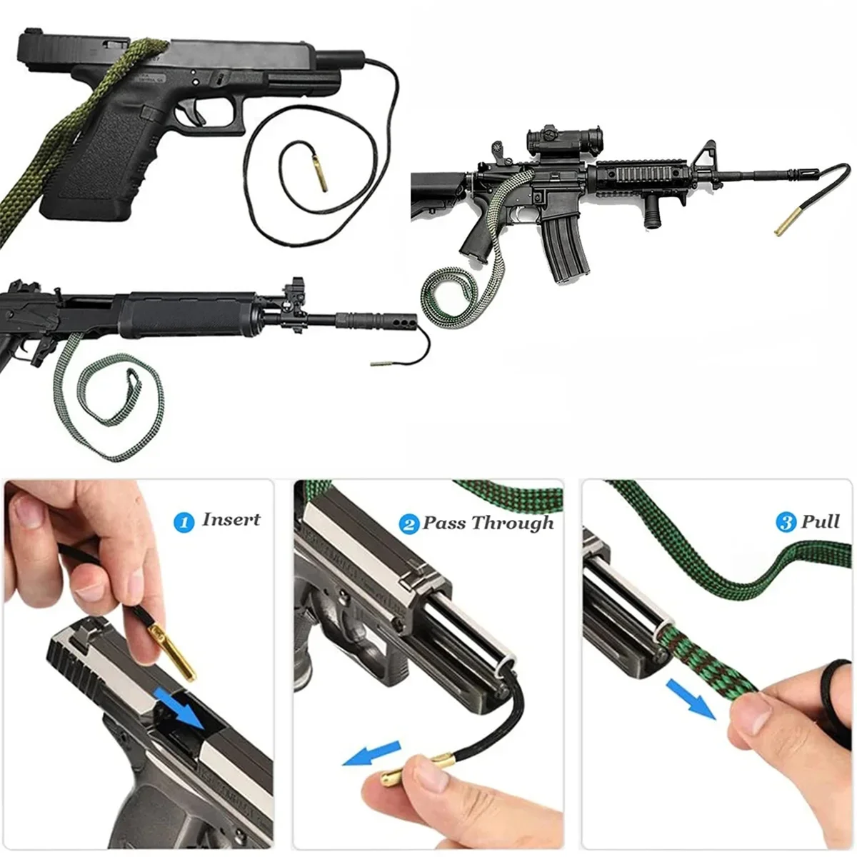 KIT DE LIMPIEZA DE PISTOLAS Para accesorios de limpieza de orificio rápido: el cable de caída ponderado de latón se desliza fácilmente por el barril, simplemente agarra y tira del cable a través del barril: un tirón lo hace todo. No hay metal expuesto que dañe el estriado o la corona, y no se requiere ensamblaje. Lavable y reutilizable cientos de veces.
