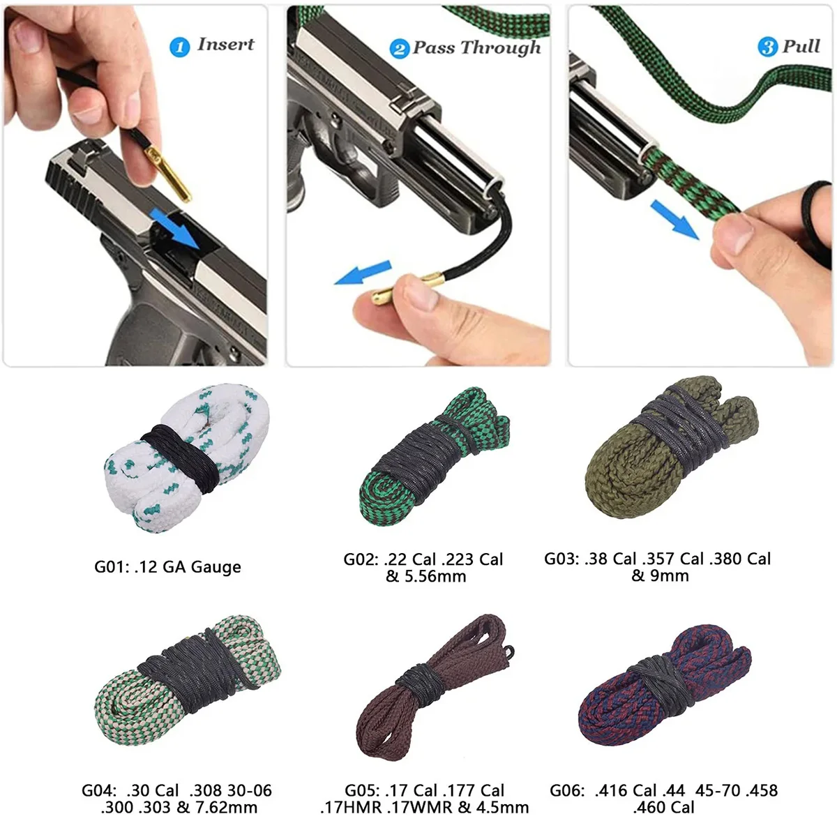 KIT DE LIMPIEZA DE PISTOLAS Para accesorios de limpieza de orificio rápido: el cable de caída ponderado de latón se desliza fácilmente por el barril, simplemente agarra y tira del cable a través del barril: un tirón lo hace todo. No hay metal expuesto que dañe el estriado o la corona, y no se requiere ensamblaje. Lavable y reutilizable cientos de veces.