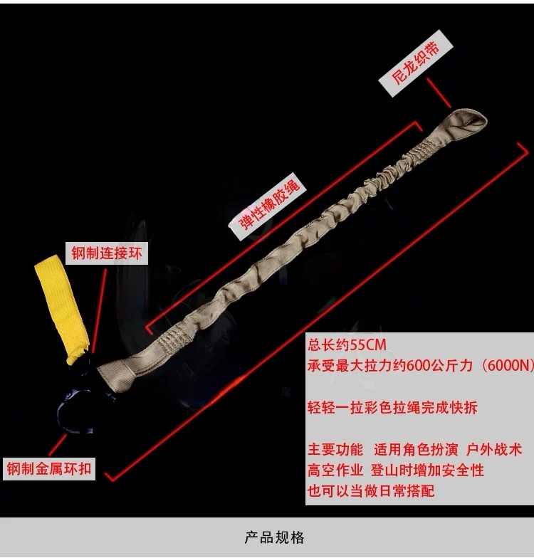 La longitud total es de aproximadamente 55 cm, capaz de soportar una fuerza de tracción máxima de aproximadamente 600 kilogramos (6000 N).Se puede desmontar rápidamente simplemente tirando de la cuerda de color.Funciones principales: Es adecuado para juegos de rol en operaciones tácticas al aire libre a gran altitud, mejorando la seguridad durante el montañismo y también se puede utilizar como accesorio diario.