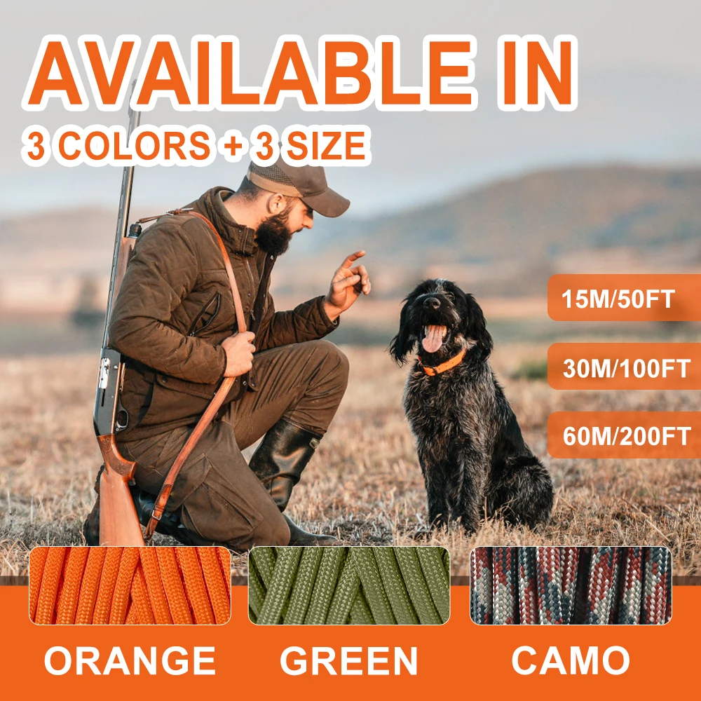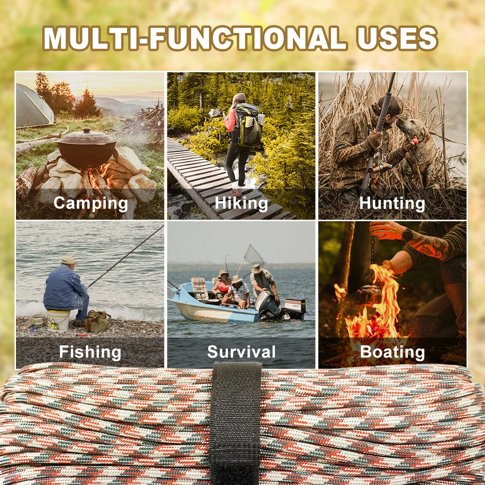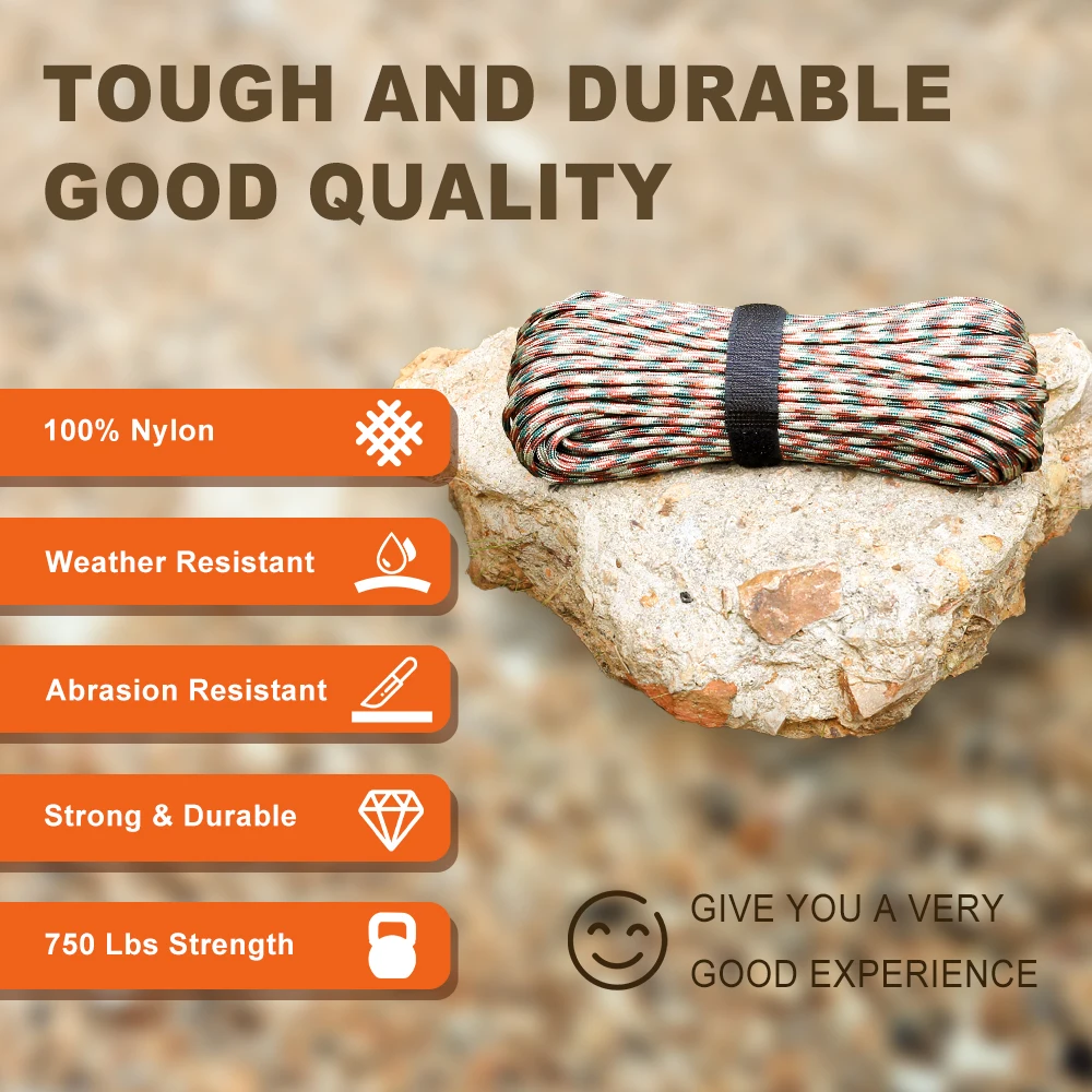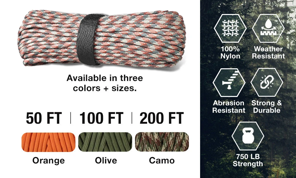5. Disponible en tres longitudes populares: 50 pies, 100 pies, e incluso un carrete de 200 pies para satisfacer sus necesidades específicas. Ofrecemos tres atractivas opciones de color que son las favoritas entre los entusiastas: paracord verde, paracord de camuflaje y paracord naranja.