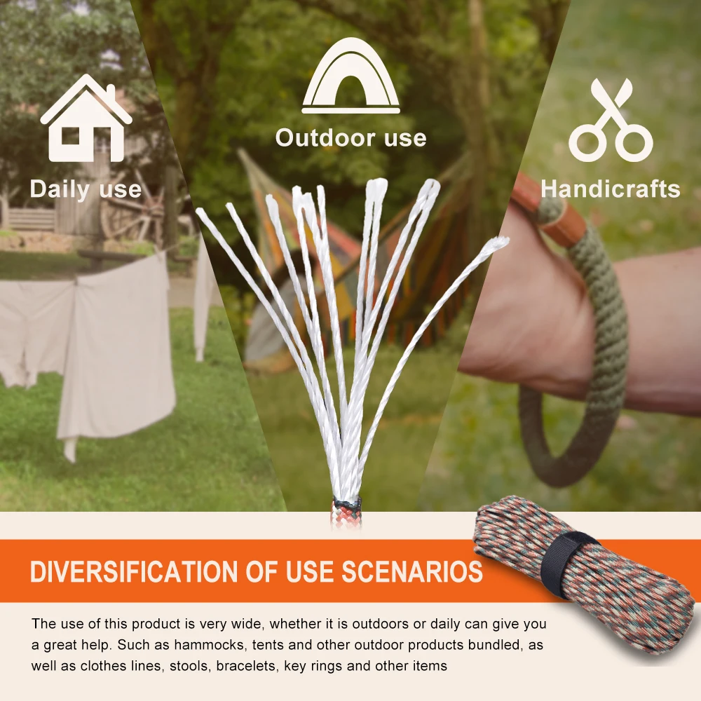 3. Independientemente de si está buscando un paracord para acampar, cazar, pescar y explorar el aire libre, nuestro paracord multiusos se adapta para satisfacer todas las necesidades. También son perfectos proyectos de manualidades de bricolaje como cordones, pulseras, agarres de herramientas, collares para perros y llaveros o para tener a mano para la preparación de supervivencia.