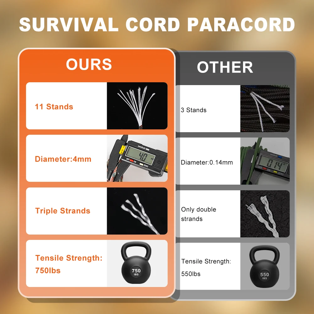 2. Con una fuerza de soporte de hasta 750 libras, este paracord de supervivencia es fuerte y confiable, lo que le brinda tranquilidad. El núcleo está construido a partir de 11 hebras internas que están hechas de 3 hebras individuales cada una, lo que proporciona una amplia resistencia para un uso sin fin.