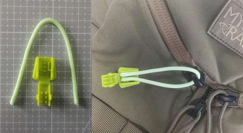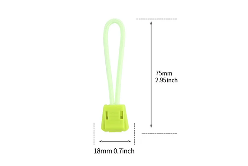 Tamaño: longitud 75mm, ancho 18mmMaterial: Material de POM/poliésterPeso: 3,2gÁmbito de aplicación: se puede utilizar para acampar, viajes de ocio, barbacoa y otras actividades al aire libre al marcar, Abrigos, Chaquetas, mochilas, cremalleras de tienda, etc.