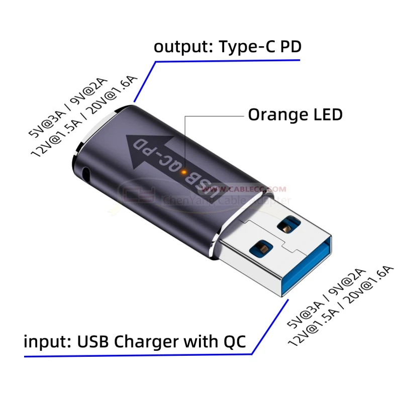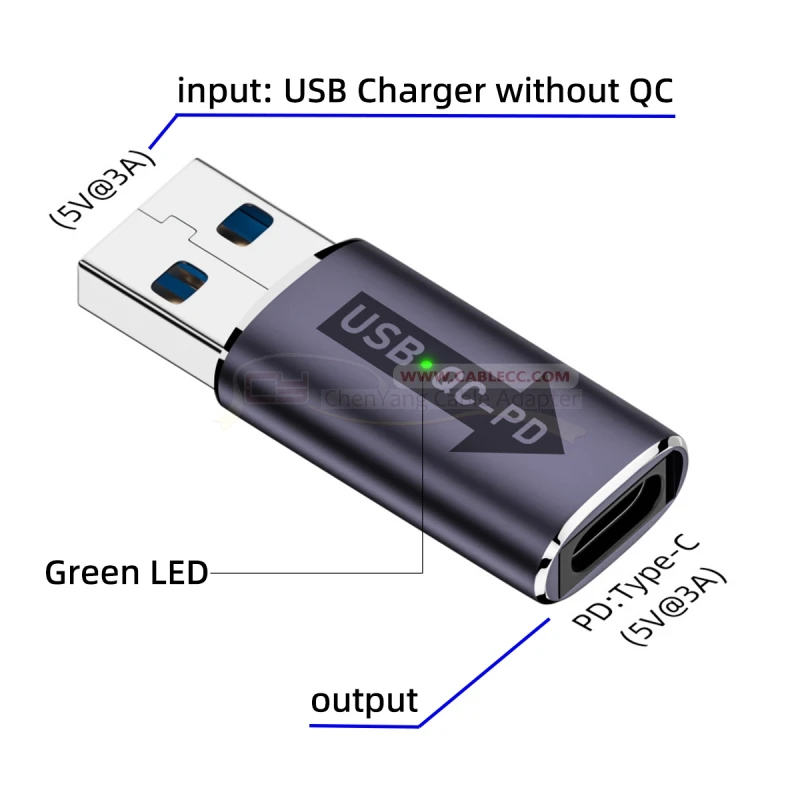 Entrada Tipo-A 5V 3A cargador sin QC y salida 5V3A Tipo-C PD Power.(El LED verde será claro)