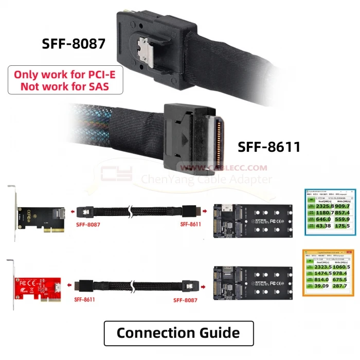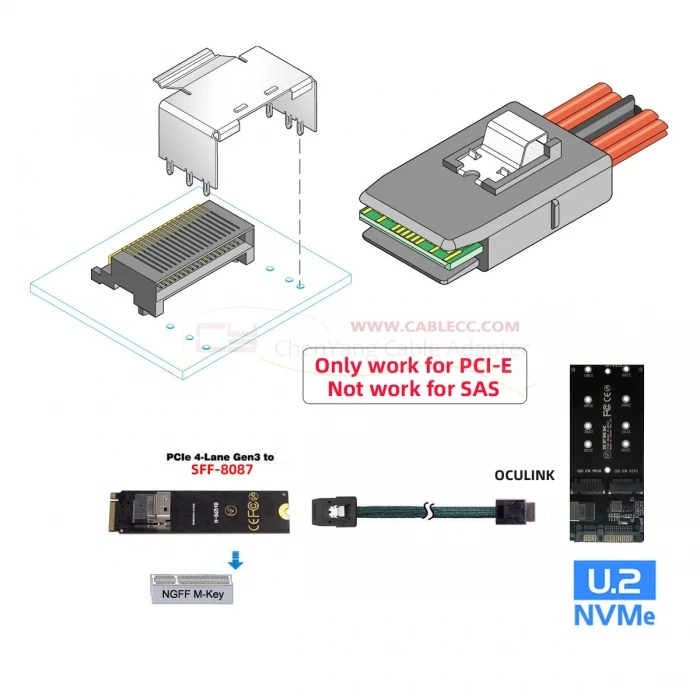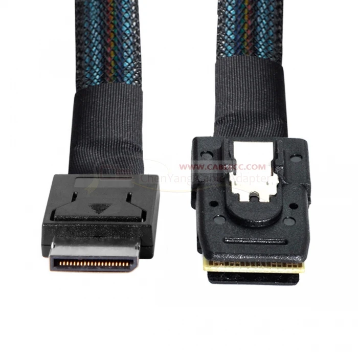 Este cable OCuLink se puede utilizar para conectar dispositivos internos, por ejemplo, un backplane con un conector PCIE a un controlador con un conector OCuLink A LA SFF-8611.