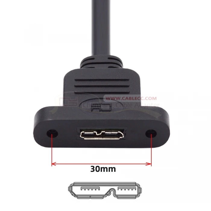 Hay 2 orificios para tornillos en el extremo hembra Micro USB 3,0. Longitud del cable: aprox. 50cm.