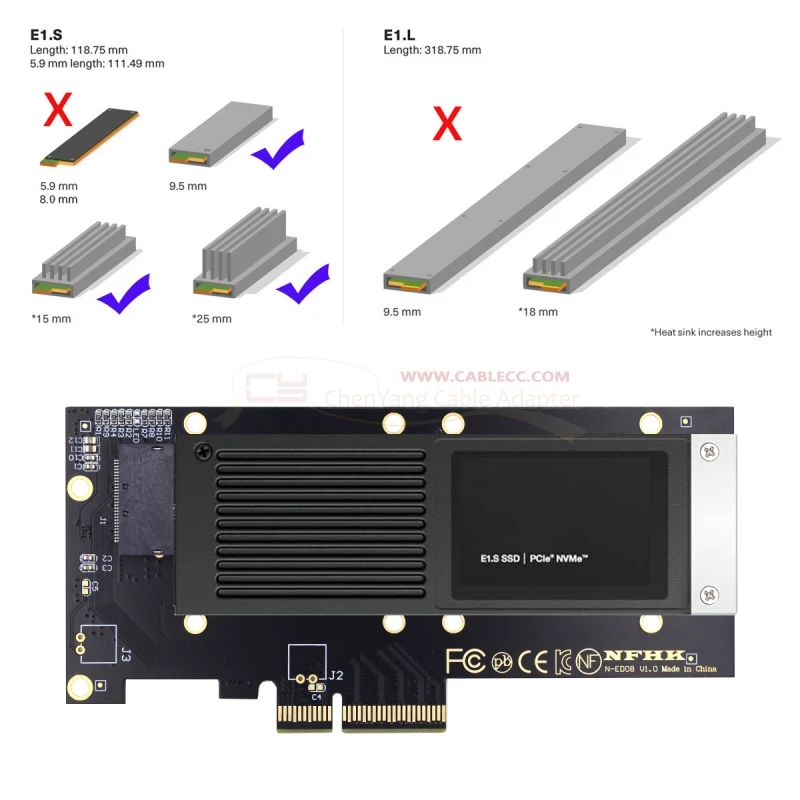 Este convertidor permite la conexión de un SSD de 2. ª generación en E1.S. Apto para SSD de 5,9mm y 8,0mm sin disipador de calor.