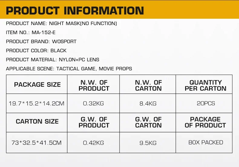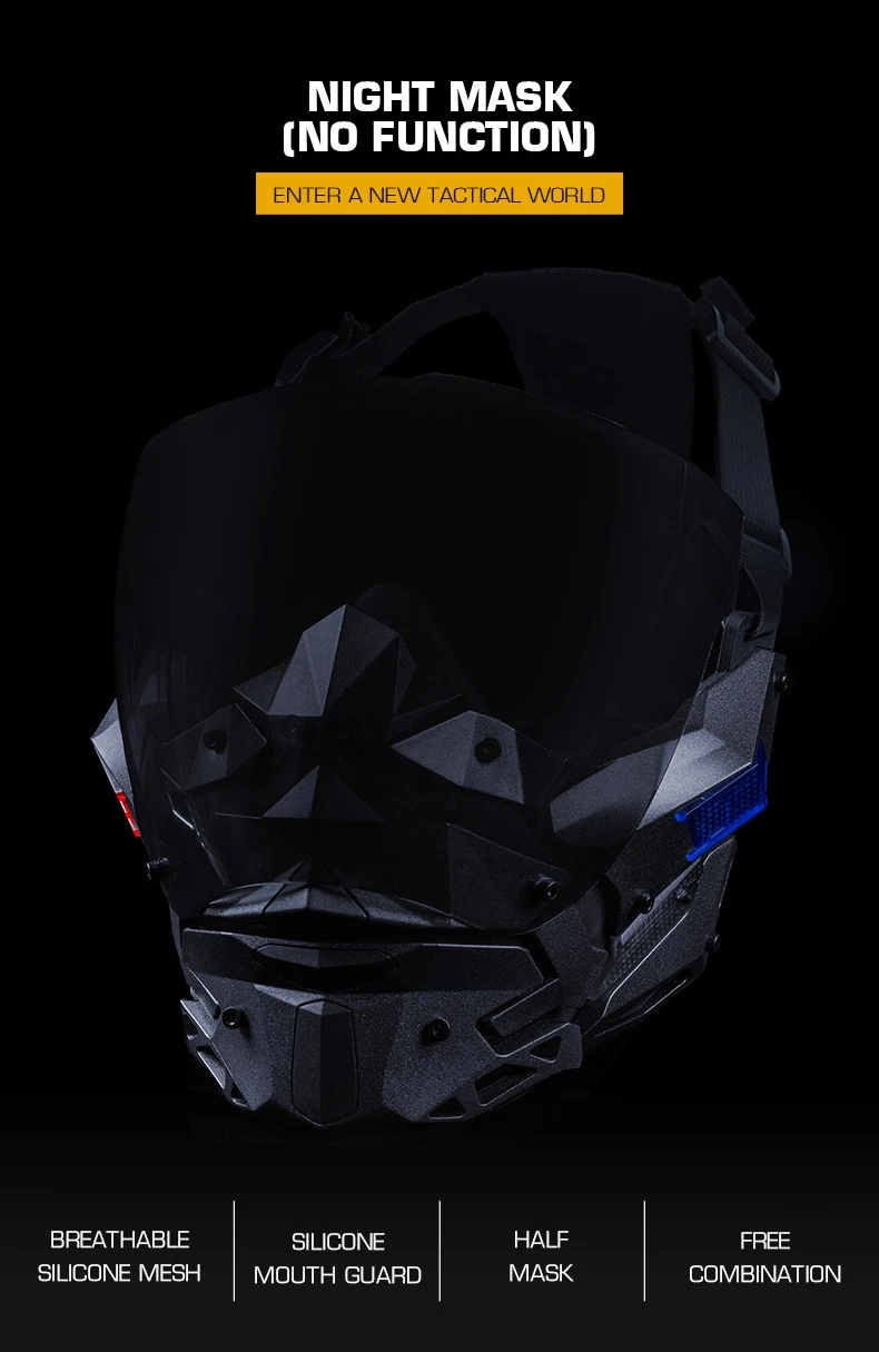 Diseñada para el táctico moderno, el entusiasta del aire y el cosplayer futurista, la MÁSCARA NIGHT combina un diseño de vanguardia con una funcionalidad de alto rendimiento.Esto no es sólo equipo; Es tu entrada en una experiencia táctica inmersiva.
