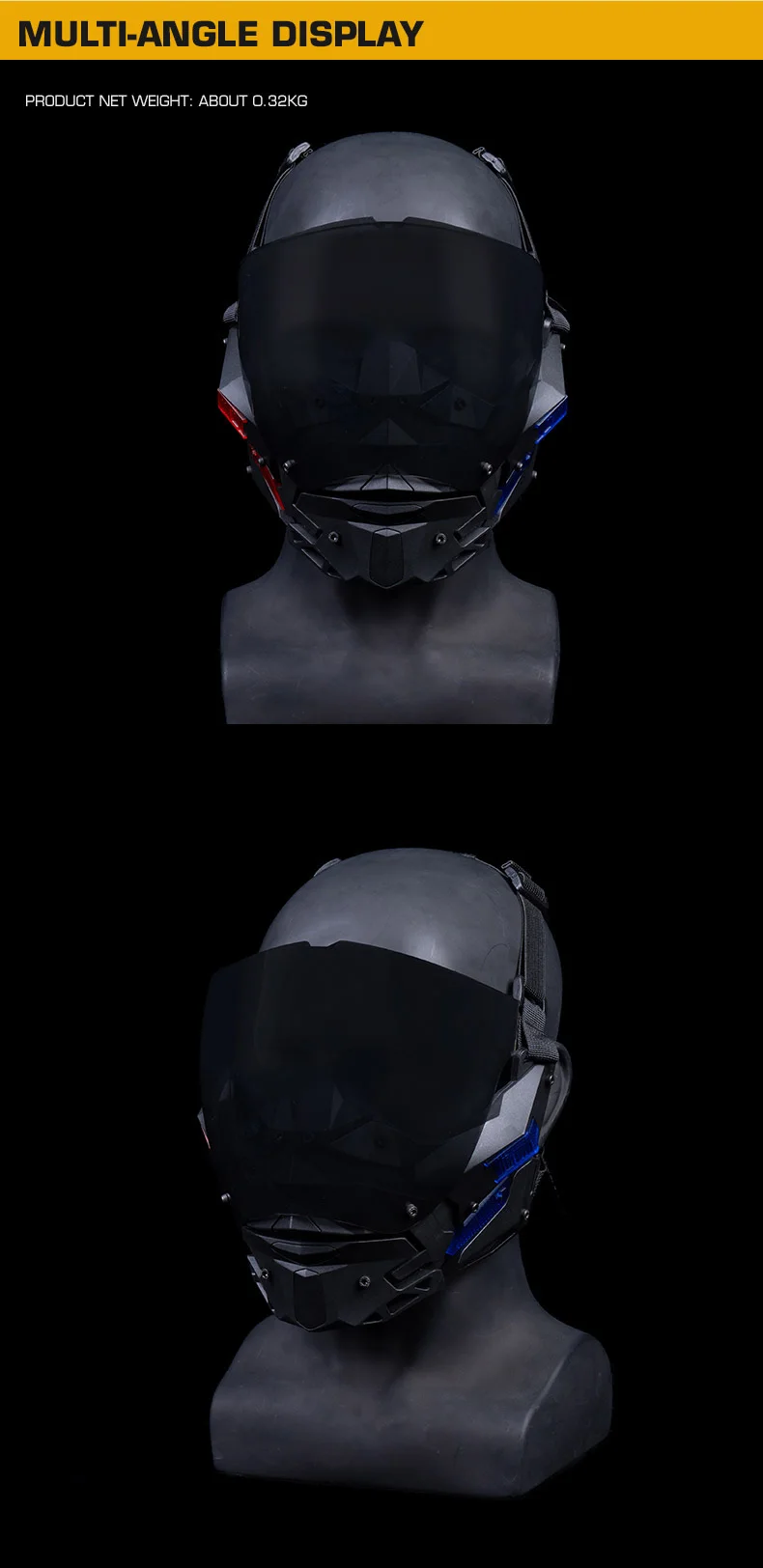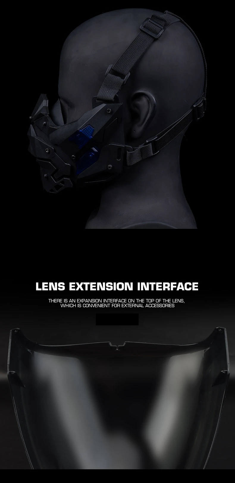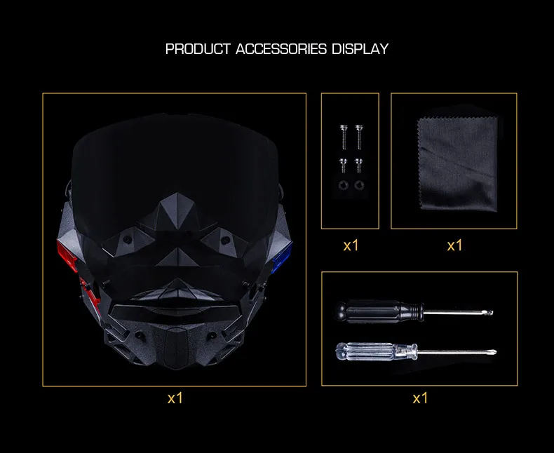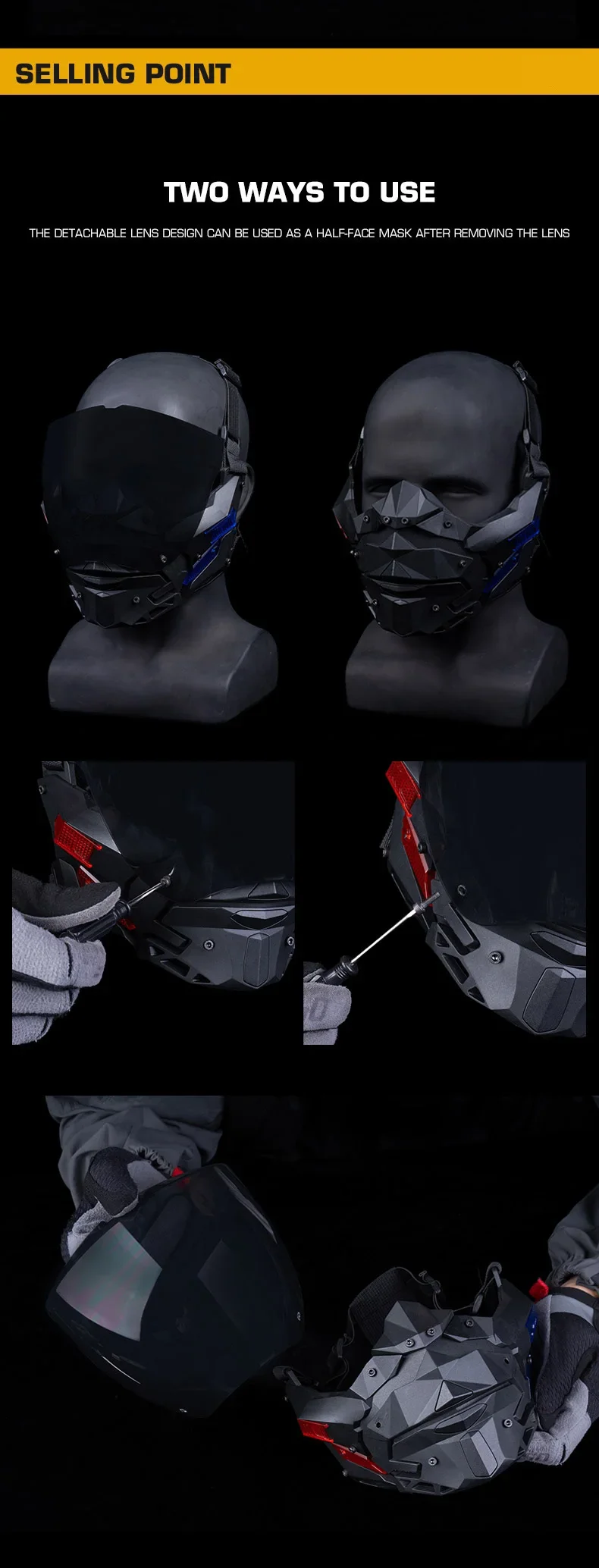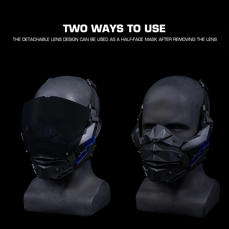 Diseño desmontable de doble uso: experimente la máxima versatilidad.Úselo con la lente para proteger completamente la cara o retírelo fácilmente (herramientas incluidas) para lucir una elegante máscara de media cara.Adaptarse a cualquier escenario en segundos.