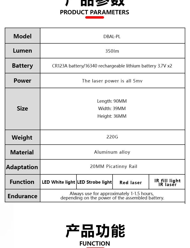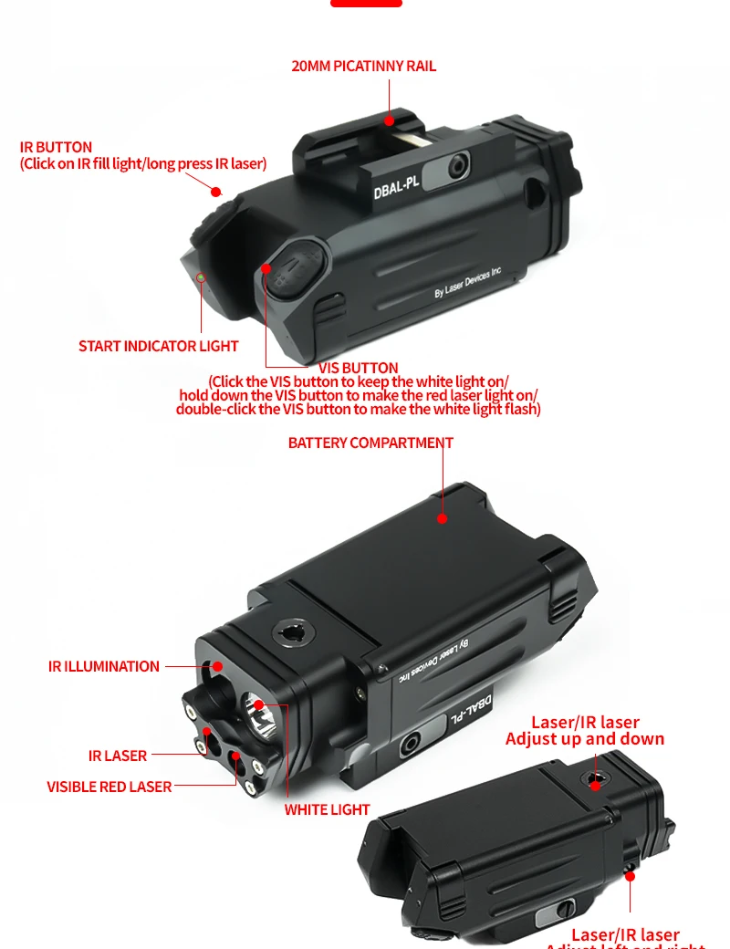 DBAL-PL táctico SBAL Scout, linterna IR, láser rojo, luz de relleno IR, LED estroboscópico colgante, indicador de puntería, puntero láser de 20MM