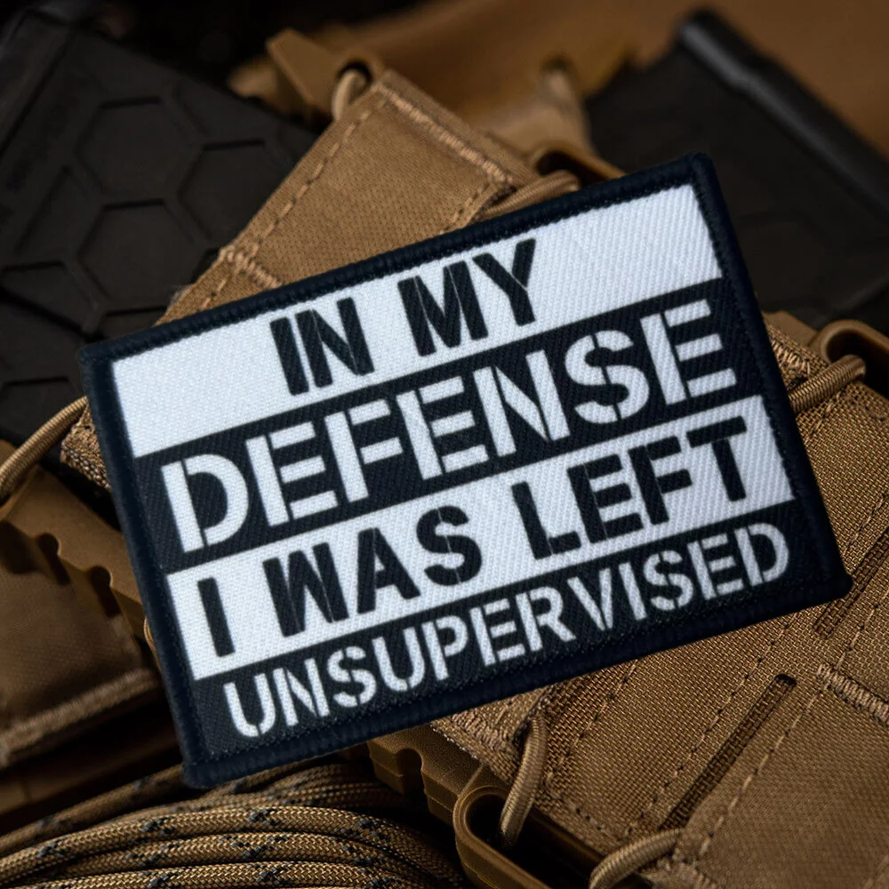 En mi defensa me quedaron sin supervisión Parche meme Humor Sarcástico Impreso Emblema de gancho y bucle Insignia de moral militar Mochila Pegatinas