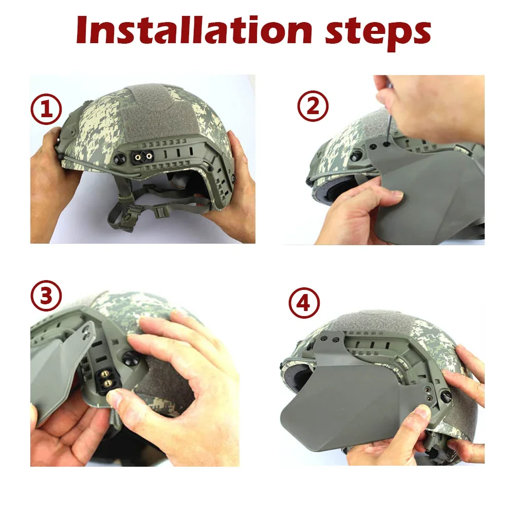---Especificación--- Nombre: Cubierta lateral del casco OPS FAST Material: TPE Color: BK, TAN, OD, GRIS Embalaje: Cubierta lateral2, cubierta de tornillo1**(nota: el casco no está incluido)** Propósito: accesorios para casco, casco táctico, protección para los oídos, protección facial.