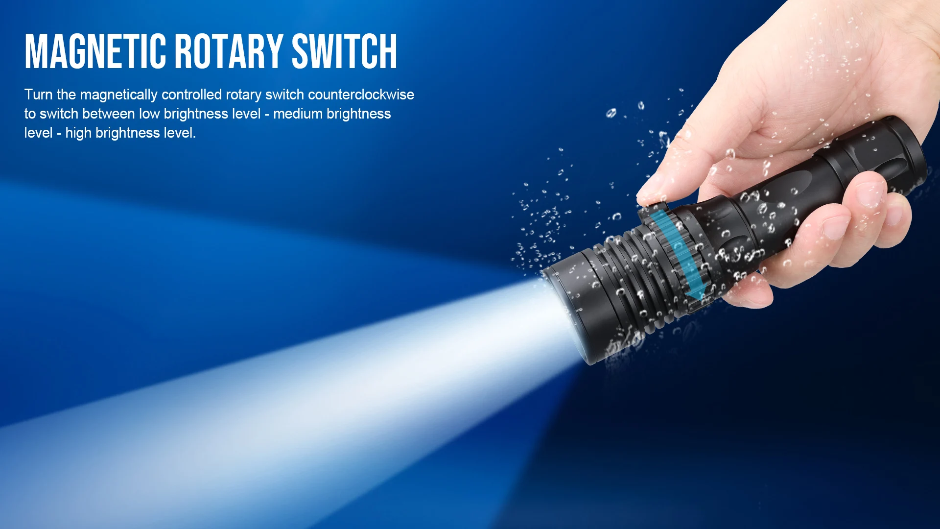 Rotate the magnetic rotary switch counterclockwise to switch between low brightness, medium brightness and high brightness.