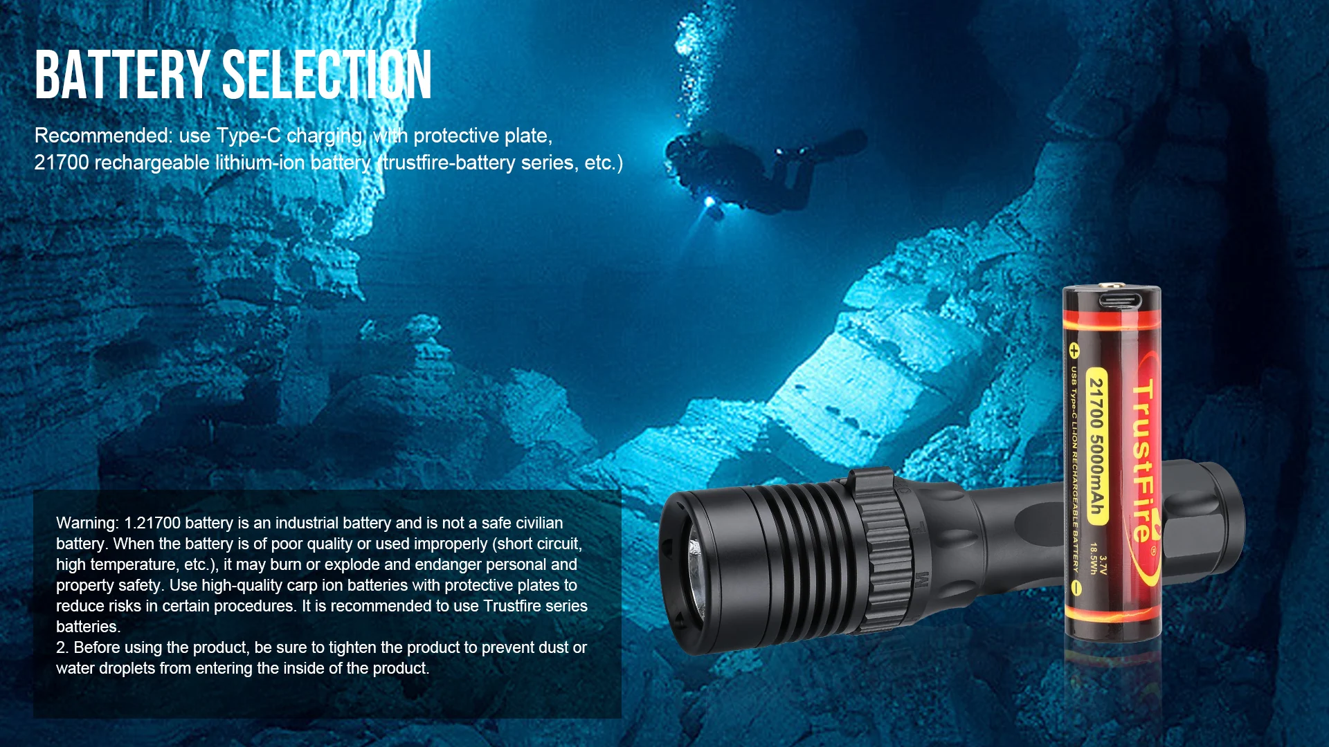 Warning: 1.21700 batteries are industrial batteries, not safe civilian batteries. When the battery is of poor quality or used improperly (short circuit, high temperature, etc.), it may burn or explode and endanger personal and property safety. Using high-quality carp-ion batteries with protection plates can reduce the risk in some procedures. It is recommended to use Trustfire series batteries. 2. Before using the product, be sure to tighten the product to prevent dust or water droplets from entering the interior of the product.