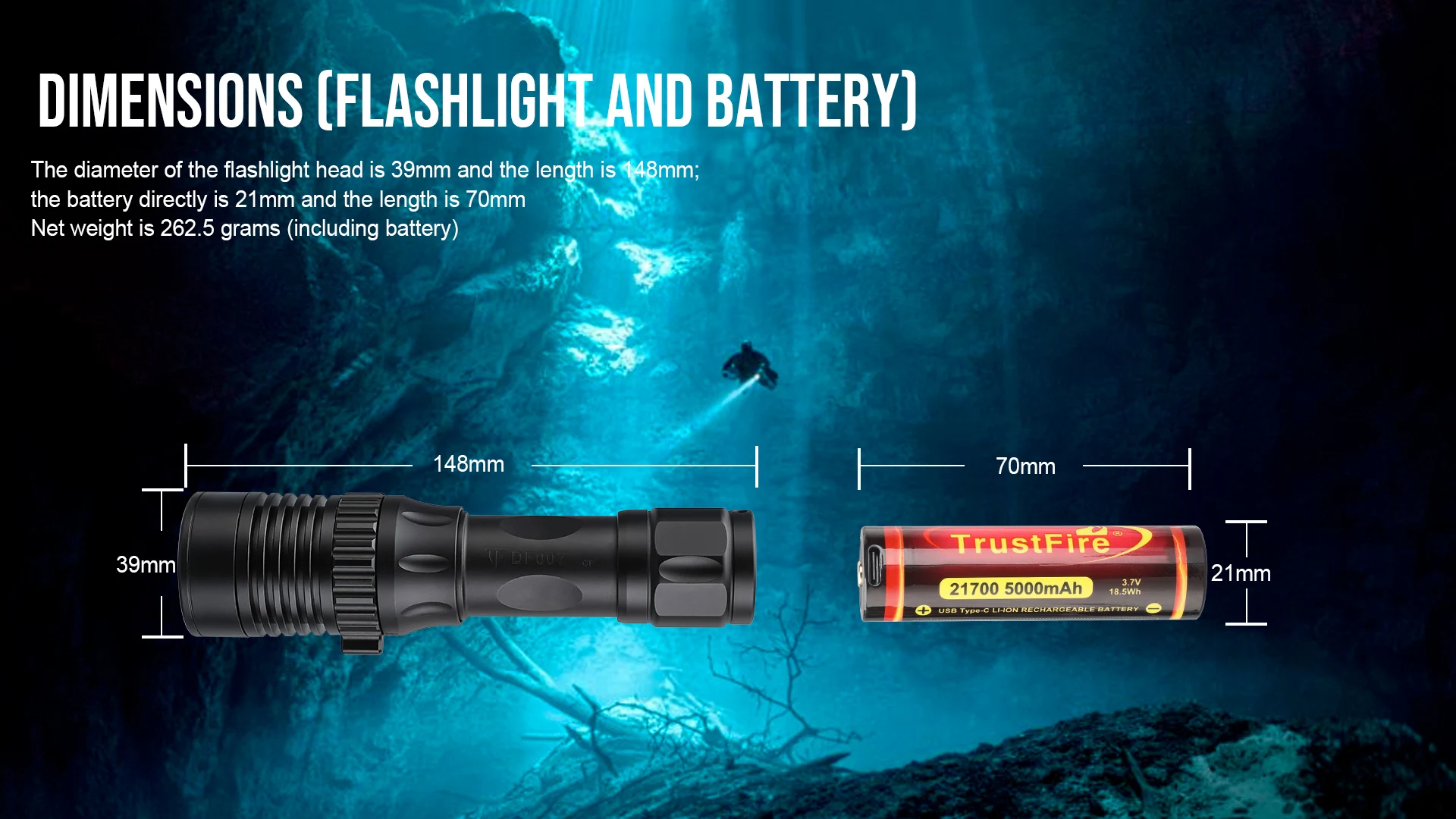 Flashlight head diameter 39mm, length 148mm; battery diameter 21mm, length 70mm Net weight 262.5g (including battery)