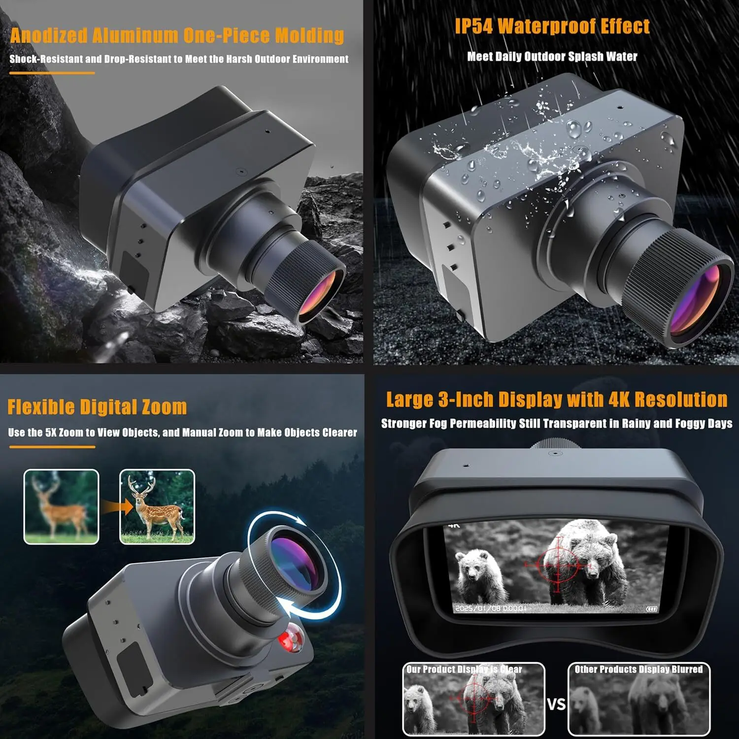 Características: 【Pantalla grande de 3'' para una visualización inmersiva】Equipadas con una pantalla de alta resolución de 3 pulgadas y un zoom digital de 5x, estas gafas de visión nocturna ofrecen imágenes nítidas y detalles vívidos incluso en total oscuridad.Una idea de regalo de cumpleaños creativa y genial para hombres que tienen todo o disfrutan de gadgets de alta tecnología. 【Vero dispositivo de visión nocturna digital 4K】Capture cada momento claramente con estos binoculares de visión nocturna 4K, perfectos para uso diurno y nocturno.Le permiten observar la vida silvestre, los paisajes o los entornos nocturnos con facilidad.Ideal para adultos y hombres que disfrutan de la exploración al aire libre o aventuras nocturnas. 【Batería recargable de 1700 mAh】 Disfrute de una observación duradera con una potente batería de 1700 mAh, sin necesidad de recarga constante ni compras adicionales.Un regalo práctico y atento para papá, esposo, novio o cualquier persona a la que le guste explorar el aire libre. 【Regalo genial para cualquier ocasión】Ya sea un regalo de Navidad, una sorpresa para el Día del Padre, un regalo de aniversario o una idea del Día de San Valentín, este dispositivo de visión nocturna 4K es uno de los mejores regalos para hombres, padres o entusiastas del aire libre. Elegante, funcional y memorable: perfecto para viajar, acampar o regalar durante todo el año.