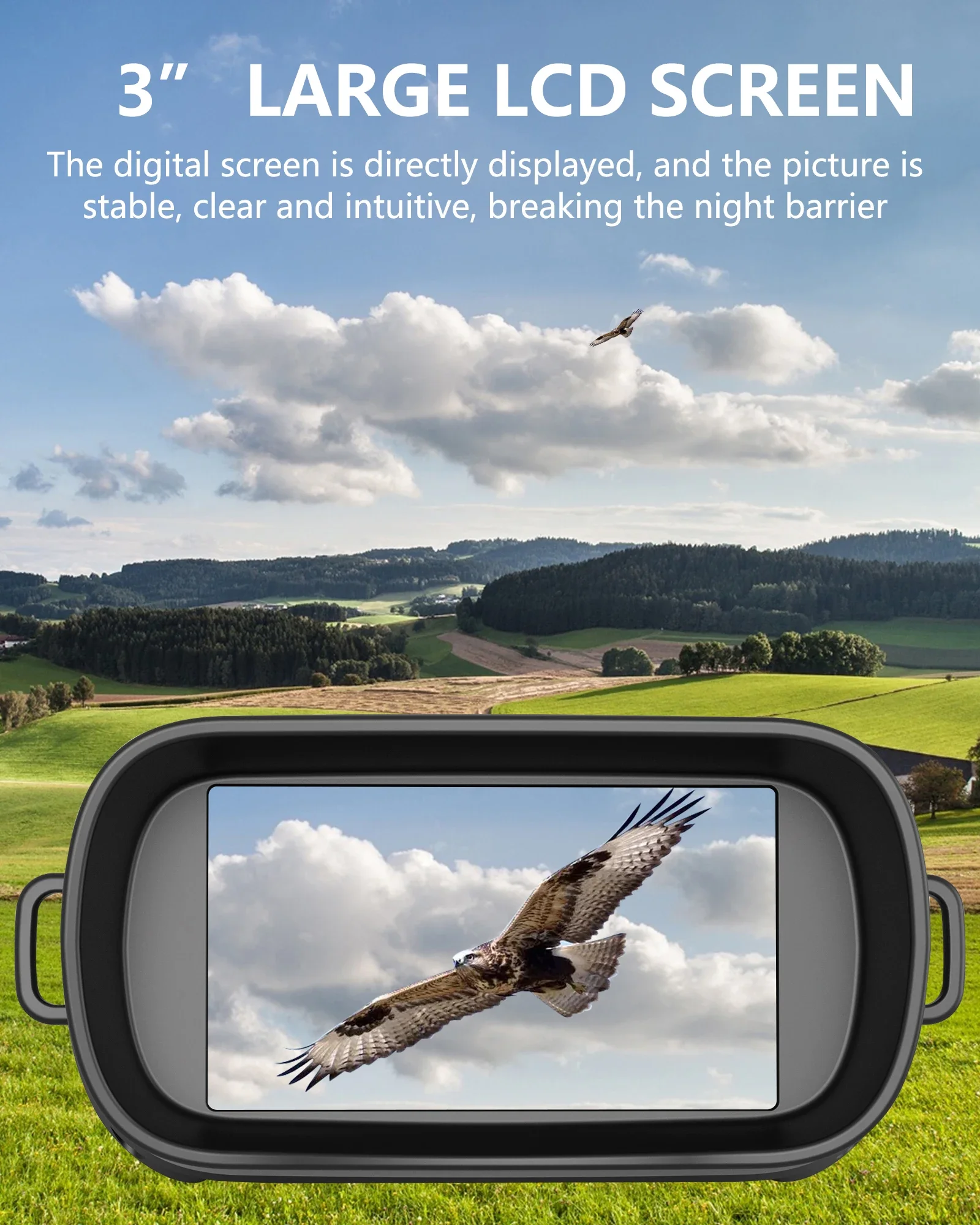 2.Pantalla de 3 pulgadas: este binocular de visión nocturna cuenta con una pantalla TFT de 3 pulgadas con una resolución de 854*480, que ofrece a los usuarios una excelente experiencia de visualización para observación y reproducción en tiempo real de imágenes y vídeos capturados.