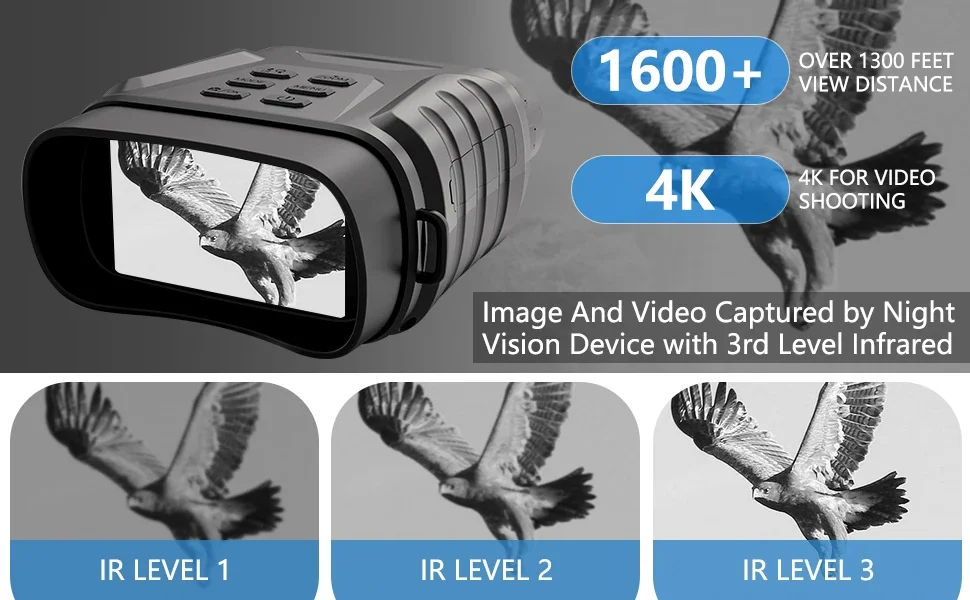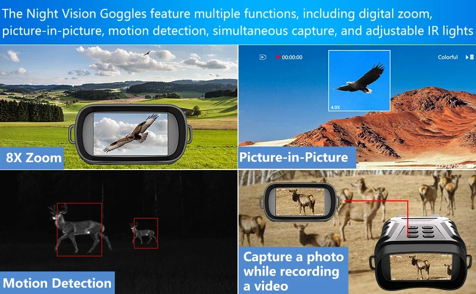 1.Binoculares infrarrojos digitales 4K de alta resolución: estas gafas de visión nocturna están equipadas con un sensor Sony de alta resolución y luces infrarrojas ajustables.Es capaz de capturar imágenes claras hasta 400 metros de distancia, incluso en completa oscuridad.La inclusión de la tecnología de reducción de ruido 3D reduce eficazmente el ruido y mejora la calidad de las imágenes fijas.Esta poderosa combinación garantiza que las gafas proporcionen una experiencia visual excepcional en diversos entornos.