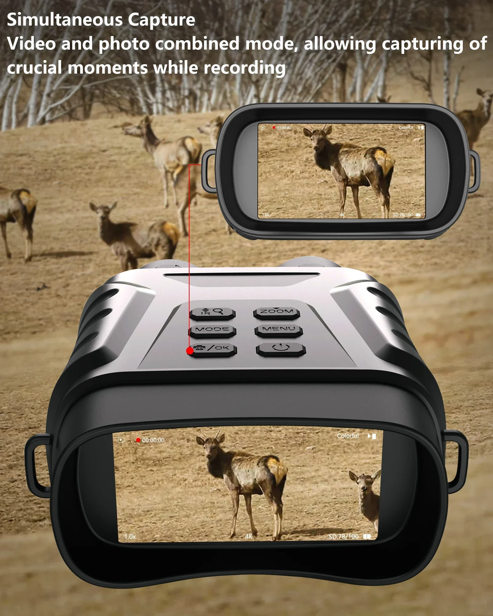 6. Interfaz de control conveniente: estas gafas de visión nocturna de grado militar integran modos de foto y video en una única interfaz, eliminando la necesidad de cambiar de modo.Las pulsaciones cortas permiten una captura rápida de fotografías, mientras que las pulsaciones prolongadas inician la grabación de video.Durante la grabación de video, los usuarios aún pueden capturar imágenes clave con una pulsación corta, brindando una experiencia de operación más conveniente y flexible, satisfaciendo diversas necesidades de monitoreo.