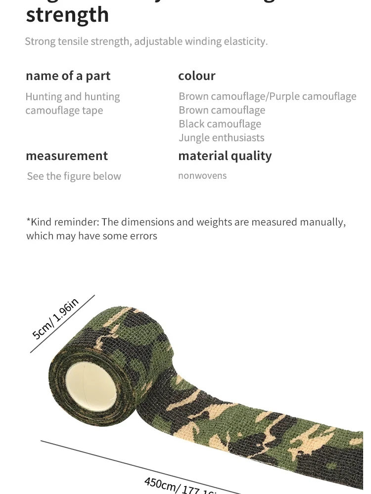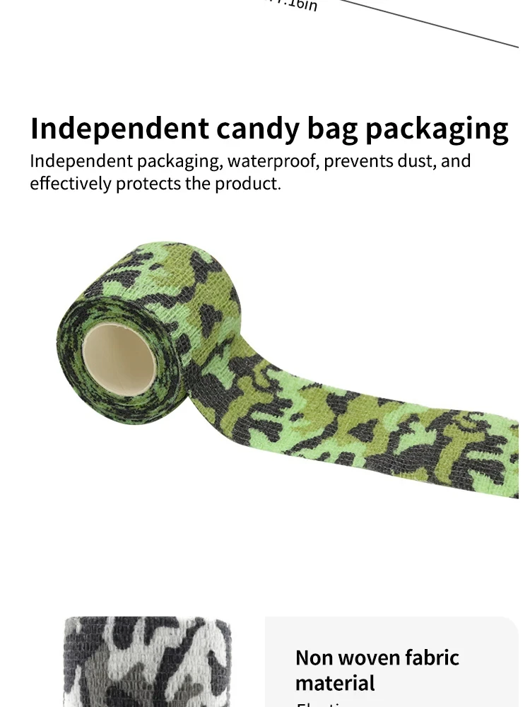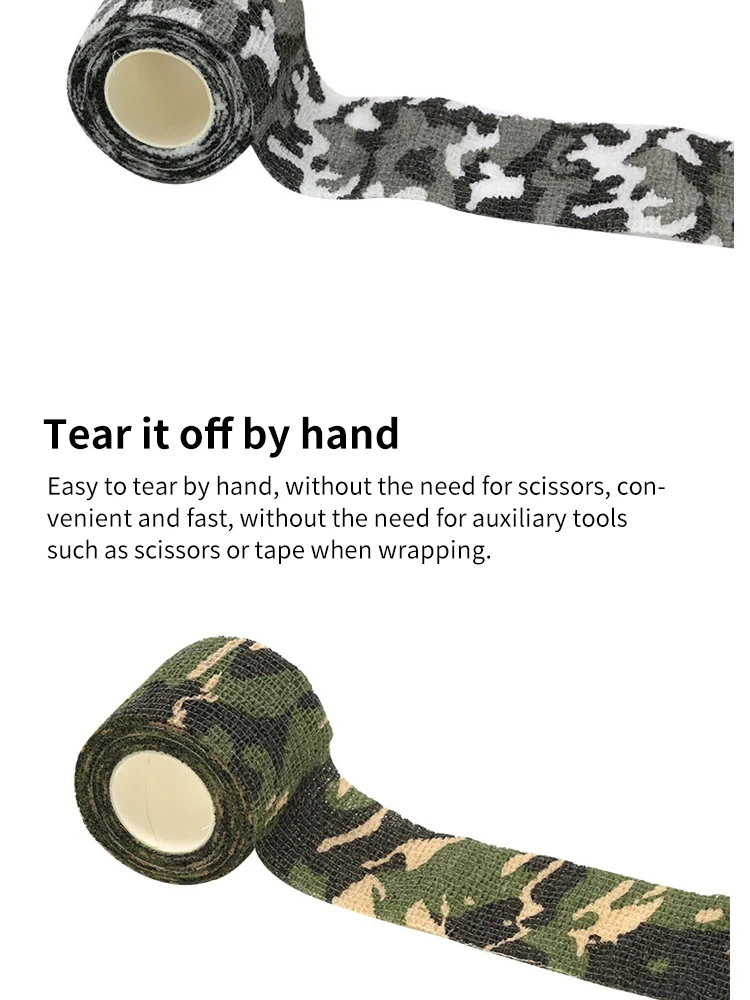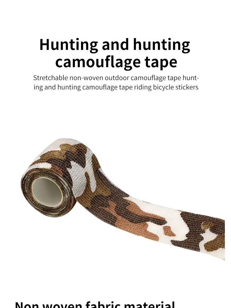 Efecto de camuflaje: la función principal de la cinta de camuflaje es simular la textura y el color en el entorno natural y ayudar a los cazadores a integrarse mejor en el fondo.La cinta suele estar hecha de materiales de alta calidad, con textura y color realistas, lo que puede reducir eficazmente la visibilidad de los cazadores.