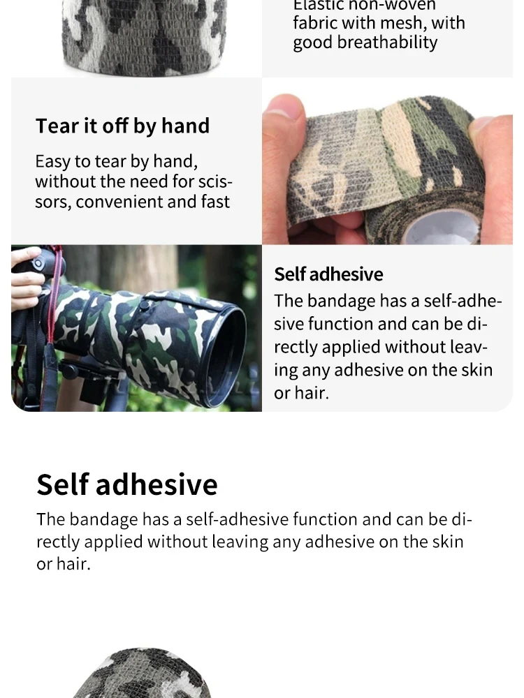Adáptese a diversos terrenos: El diseño de cinta de camuflaje tiene en cuenta las necesidades de diferentes terrenos y fondos. Puede adaptarse a bosques, pastizales, desiertos y otros entornos, y proporcionar la selección de textura y color correspondiente.