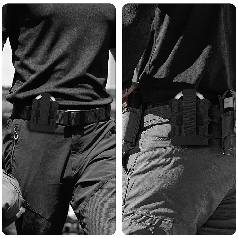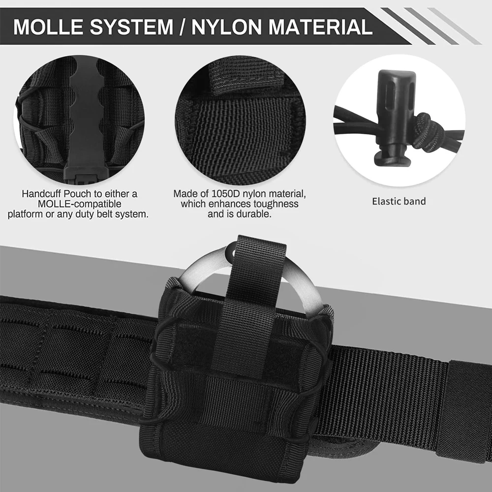 -La bolsa para esposas está diseñada para profesionales en mente.La correa elástica trasera es compatible con el sistema Molle/PALS, varios cinturones tácticos y chalecos en las batallas diarias y se adapta fácilmente a su carga táctica.Se puede montar en cinturones de hasta 2"/5 cm de ancho.